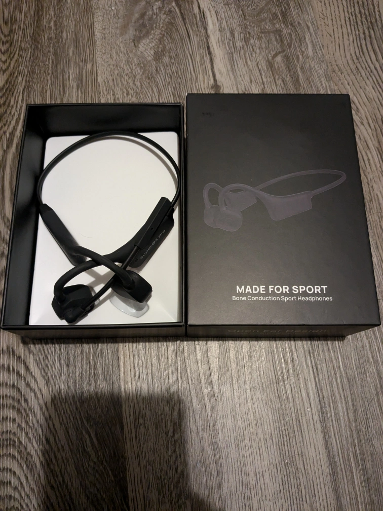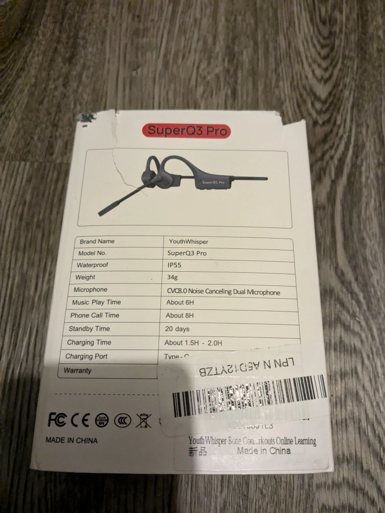 YouthWhisper SuperQ3 Pro bone conduction sport headphones. They're waterproof to IP55 and weigh only 34g. The microphone is a CVC8.0 noise cancelling dual microphone. Music play time is about 6 hours and phone call time is about 8 hours. The charging time is about 1.5 to 2 hours. The charging port is Type-C. Comes with the box!