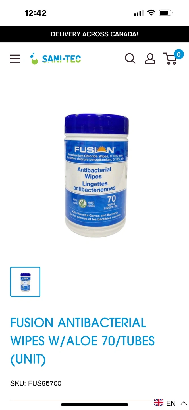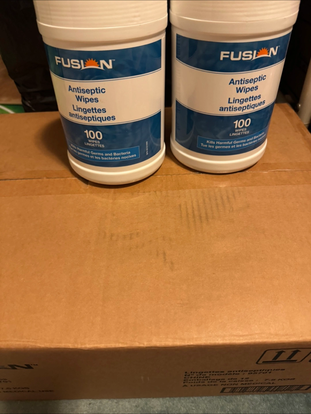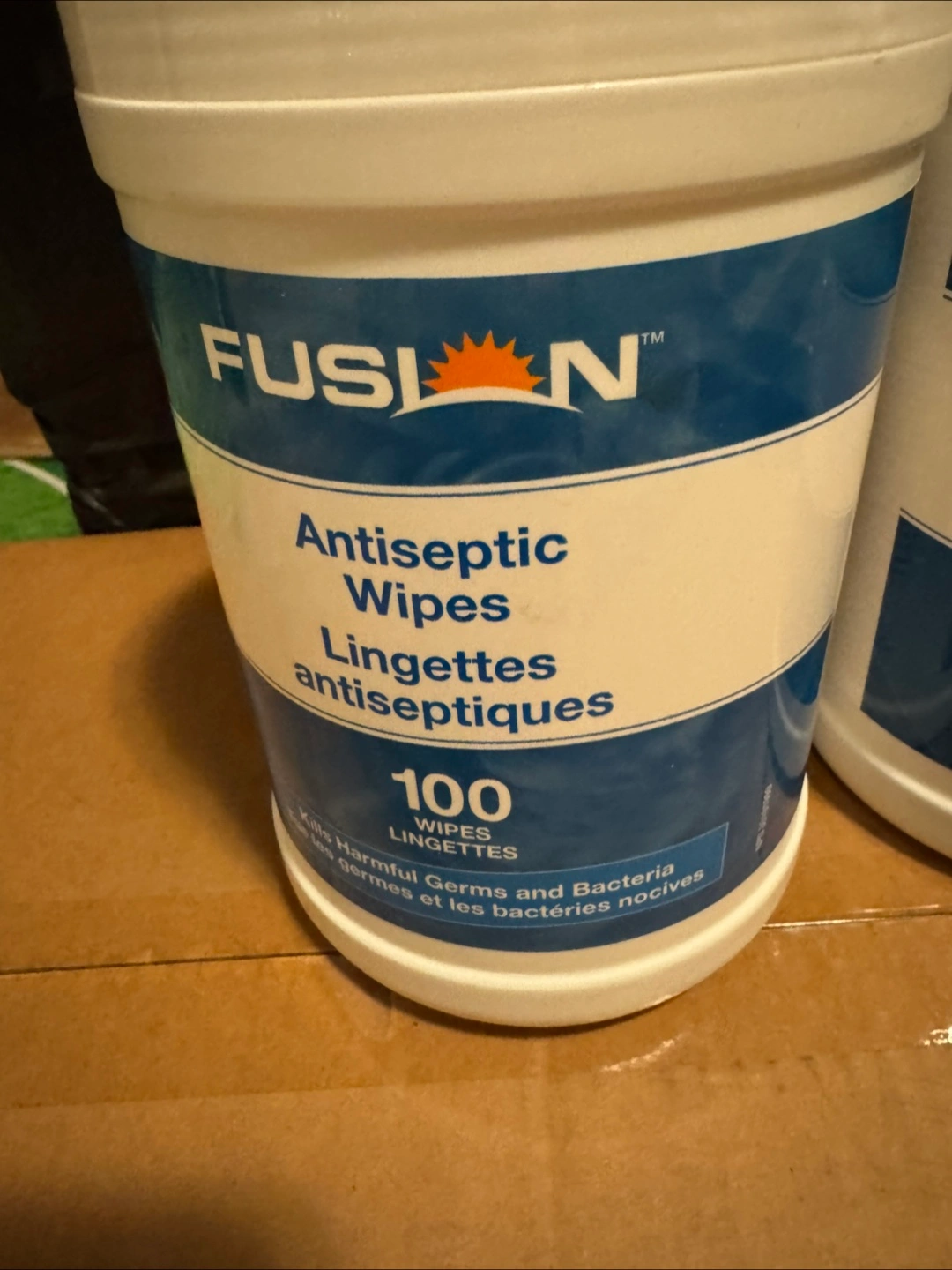 Selling a container of Fusion Antiseptic Wipes. Each container has 100 wipes, perfect for keeping your hands clean and killing harmful germs and bacteria.