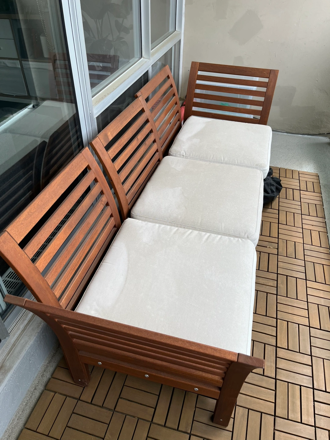 Ikea patio or balcony set. Bought in 2022, rarely used. 4 seats (2 corner seats, 2 regular seats, with 4 heavy duty pad/cushions) and 1 coffee table.