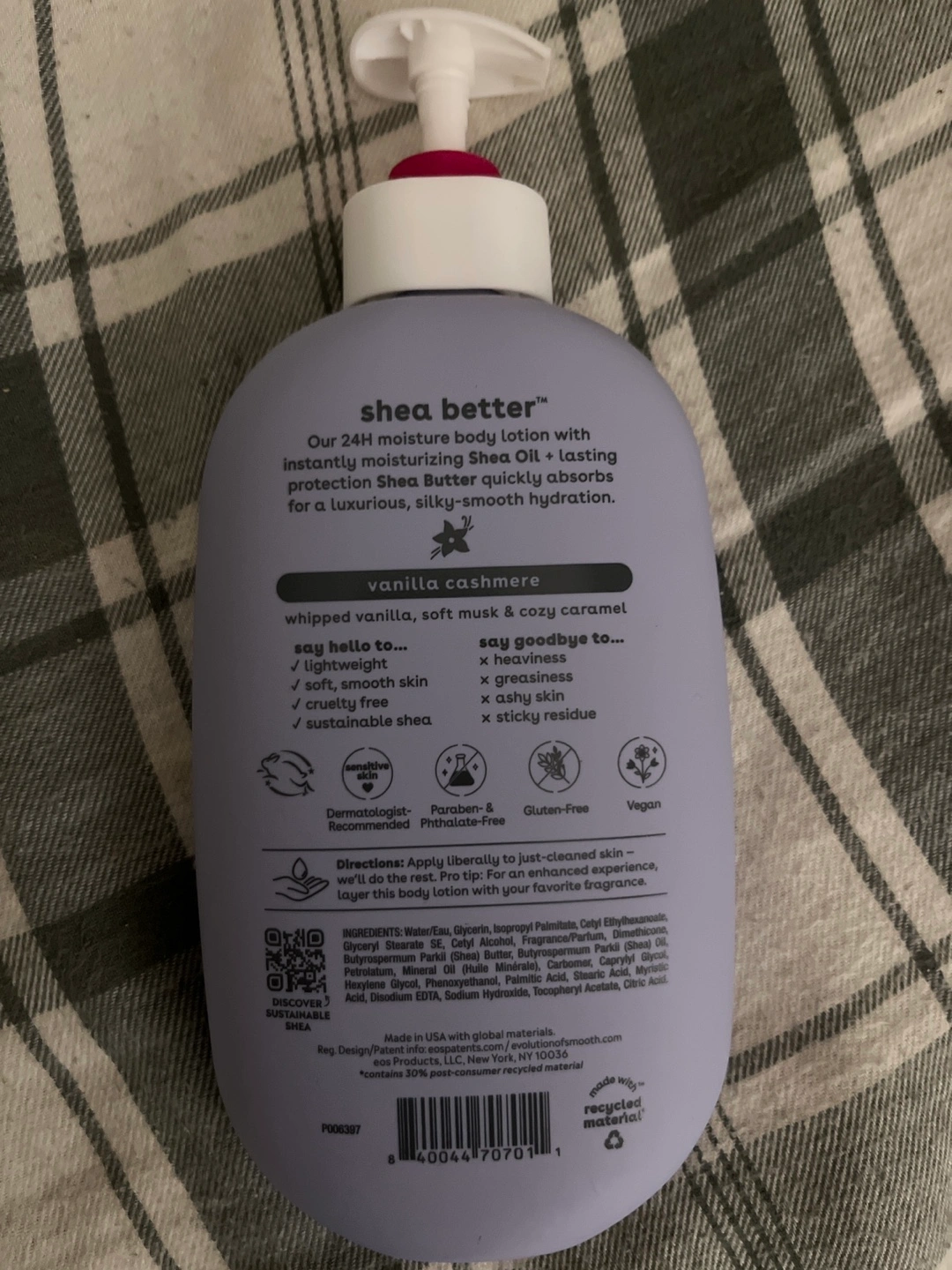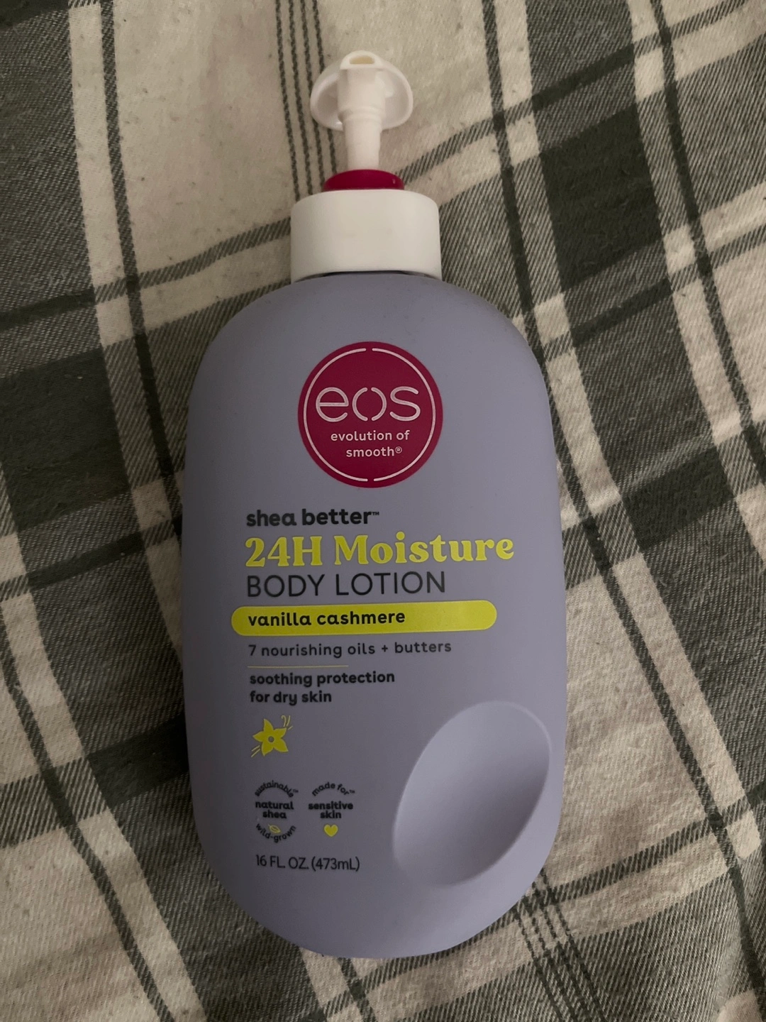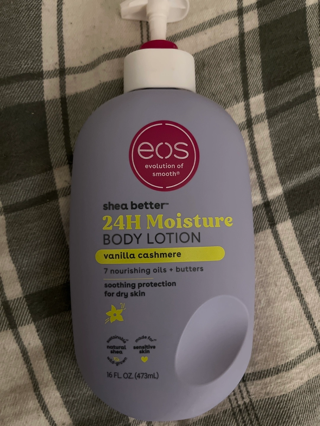 403I'm selling an EOS Shea Better 24H Moisture Body Lotion in Vanilla Cashmere. It contains 7 nourishing oils and butters and provides soothing protection for dry skin. This lotion is dermatologist-recommended, gluten-free, and vegan. It comes in a 16 fl oz (473mL) bottle. Gently used.