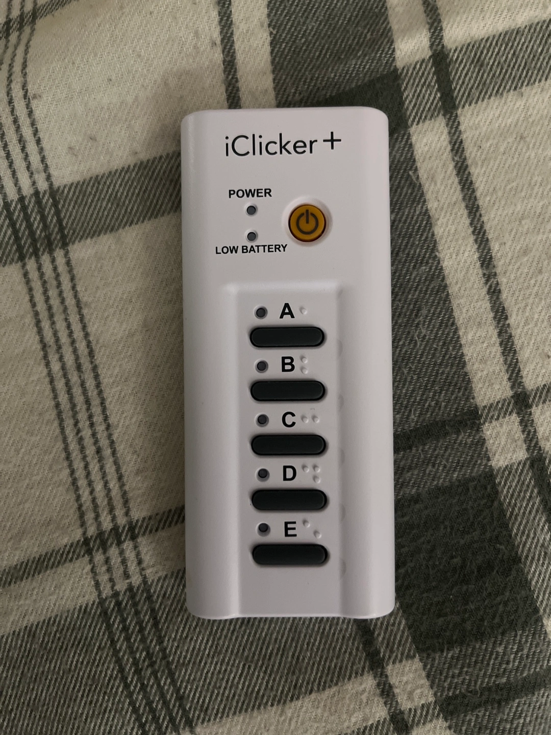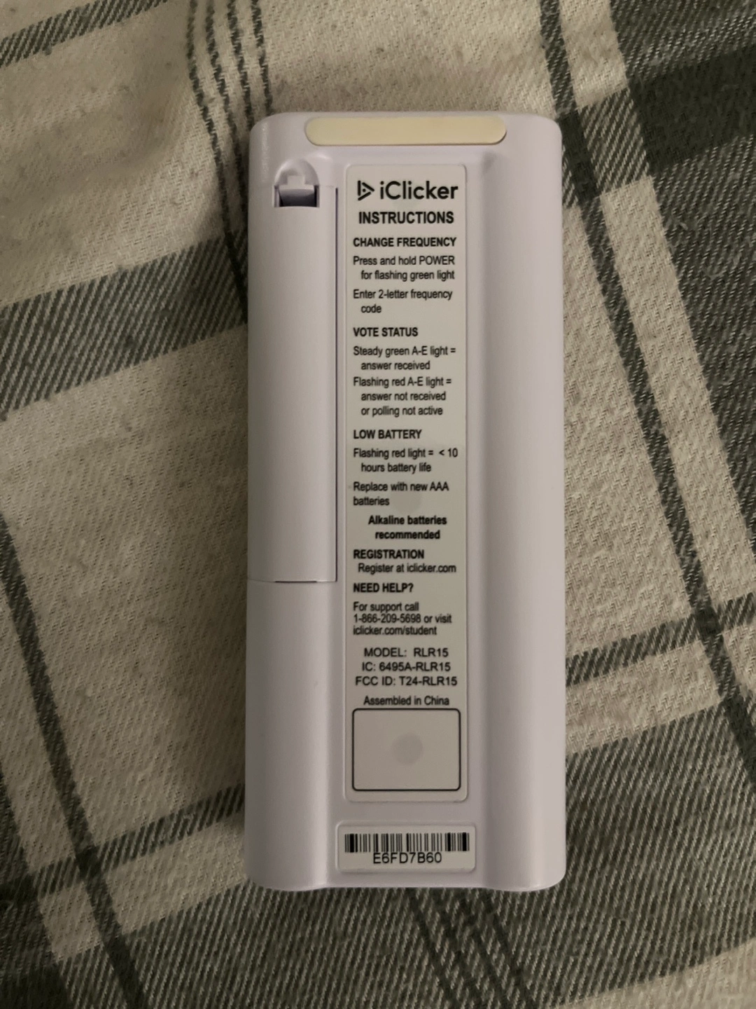 314Selling an iClicker+ RLR15 remote! It is in great condition and ready to use for your classes. The back has instructions on how to change the frequency and what the vote status lights mean. It also indicates that alkaline batteries are recommended and it was assembled in China