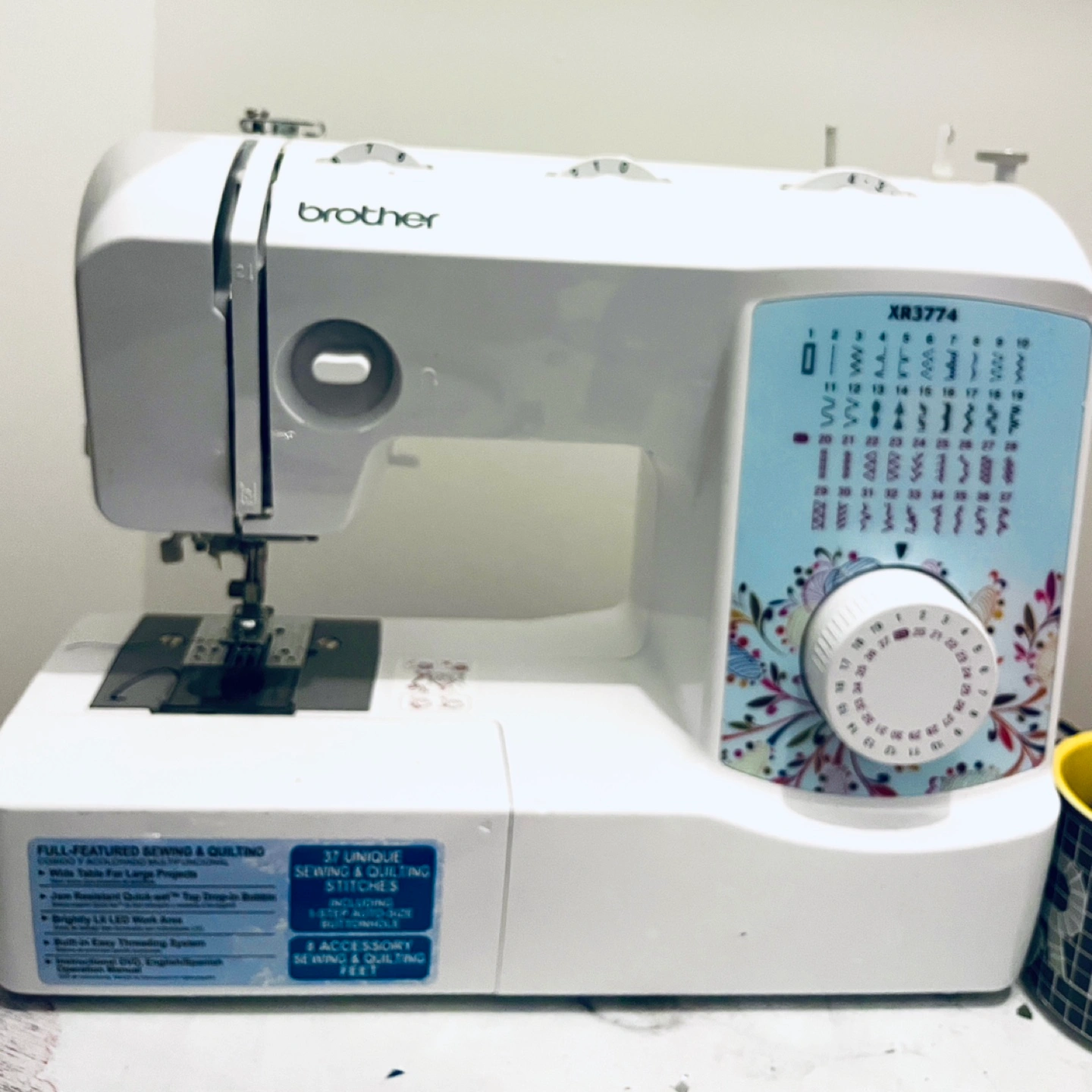 I'm selling a Brother XR3774 sewing machine. It's a full-featured sewing and quilting machine with 37 unique sewing and quilting stitches. It also features: