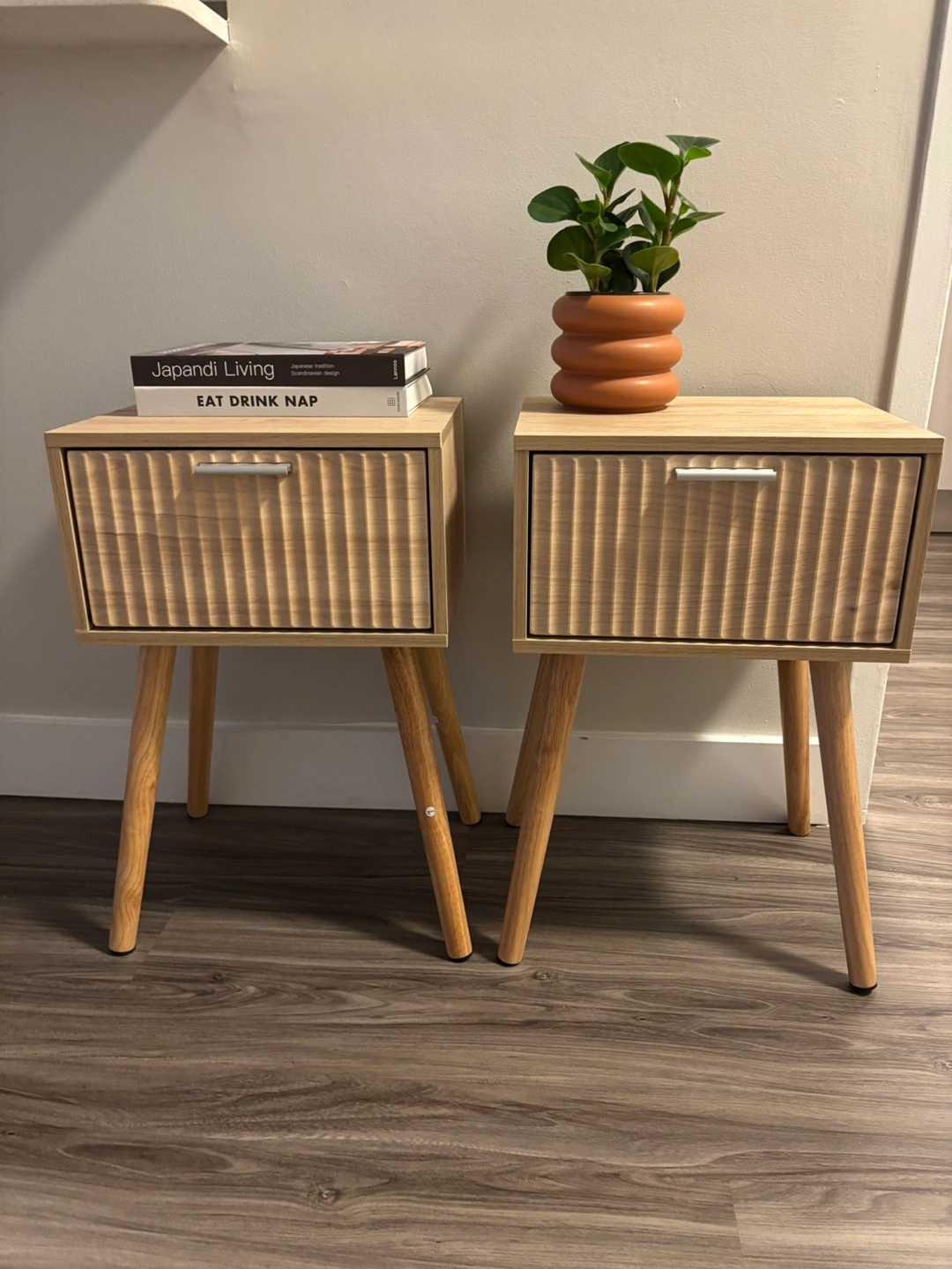 Selling a cute nightstand in a light wood finish! It's in great shape and ready to add some style to your bedroom. It features a drawer and a magnetic door for extra storage. The dimensions are approximately 13.8 inches wide, 10.6 inches deep, and 21.46 inches tall