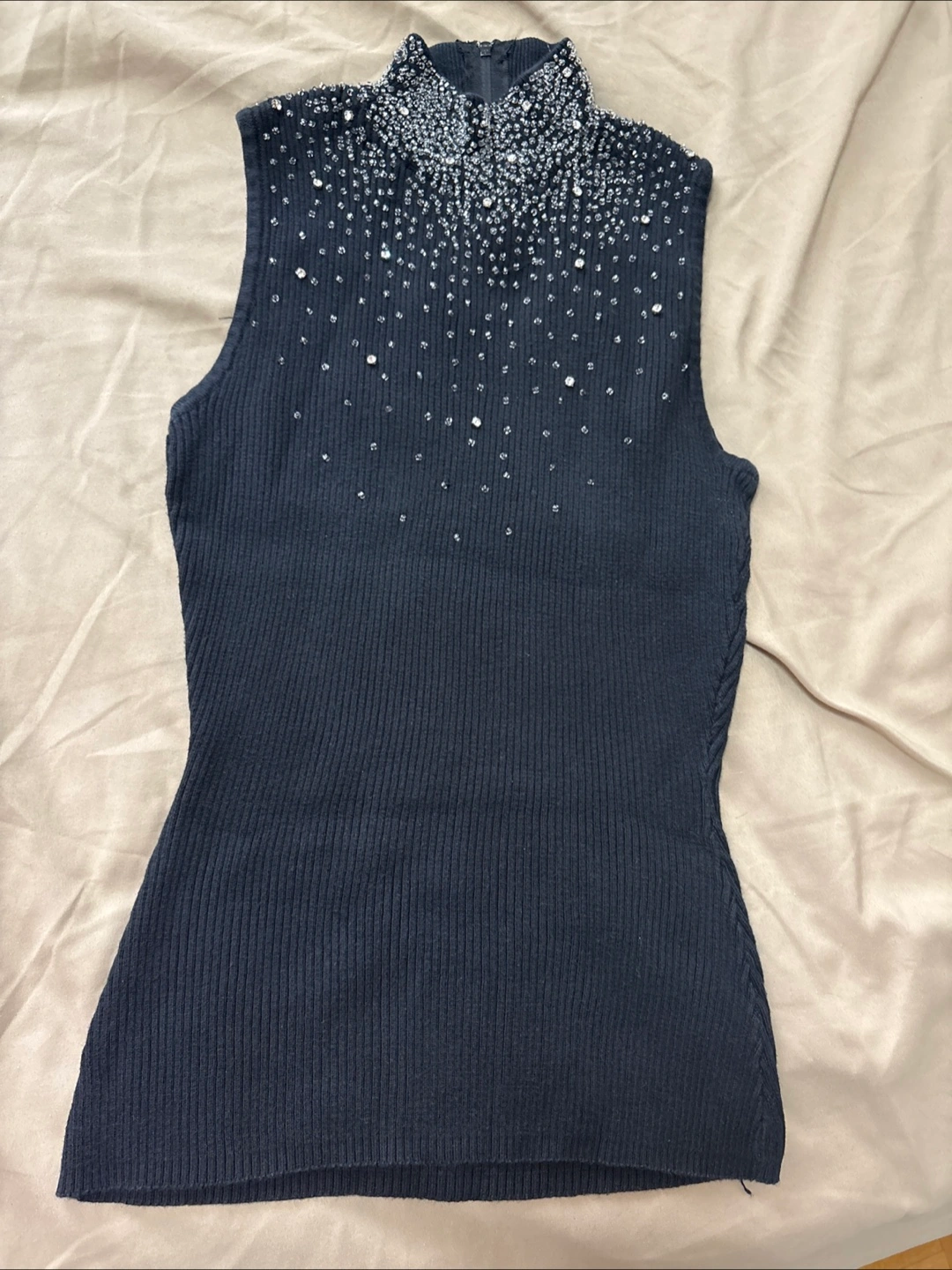 This is a Beta's Choice sleeveless top in black. It's made of 100% cotton, exclusive of trim. It has some beaded detailing around the collar. It's in great condition!