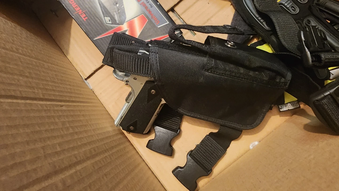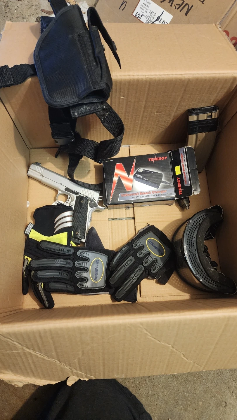 AEG battery charger, STANAG AR magazine for AEG ARs. CTAC spring bolt action airsoft rifle with no scope. Retention holster, bb loader, gloves and goggles, police vest, all decals removable via Velcro. broken KWA 1911 painted silver, needs repairs.