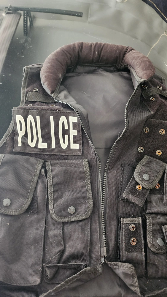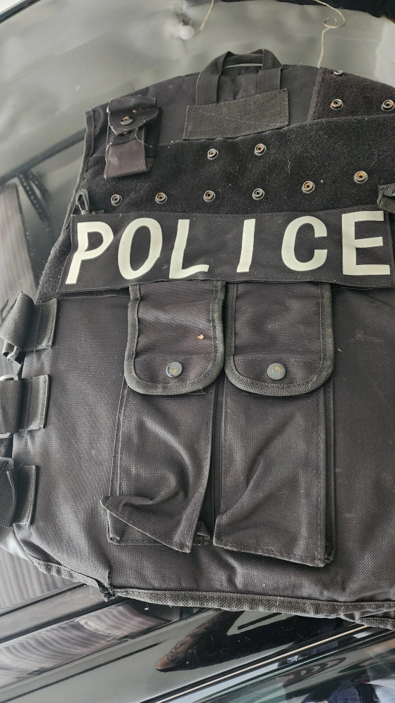 AEG battery charger, STANAG AR magazine for AEG ARs. CTAC spring bolt action airsoft rifle with no scope. Retention holster, bb loader, gloves and goggles, police vest, all decals removable via Velcro. broken KWA 1911 painted silver, needs repairs.