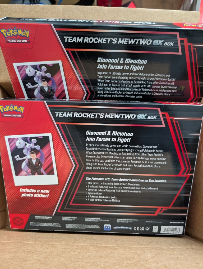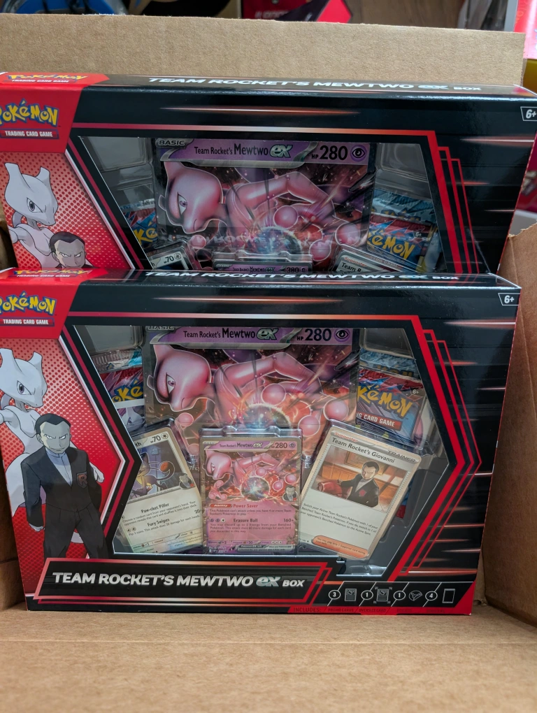 Selling a Team Rocket's Mewtwo EX Box! It includes: - 1 foil promo card featuring Team Rocket's Mewtwo ex - 2 foil cards featuring Team Rocket's Mewtwo and Team Rocket's Giovanni - 1 oversized card featuring Team Rocket's Mewtwo ex - 1 photo sticker - 4 Pokémon TCG booster packs - A code card for Pokémon TCG Live $50 each or $45 for multiple pickup is at Markham intersection of 16th Ave and BurOak