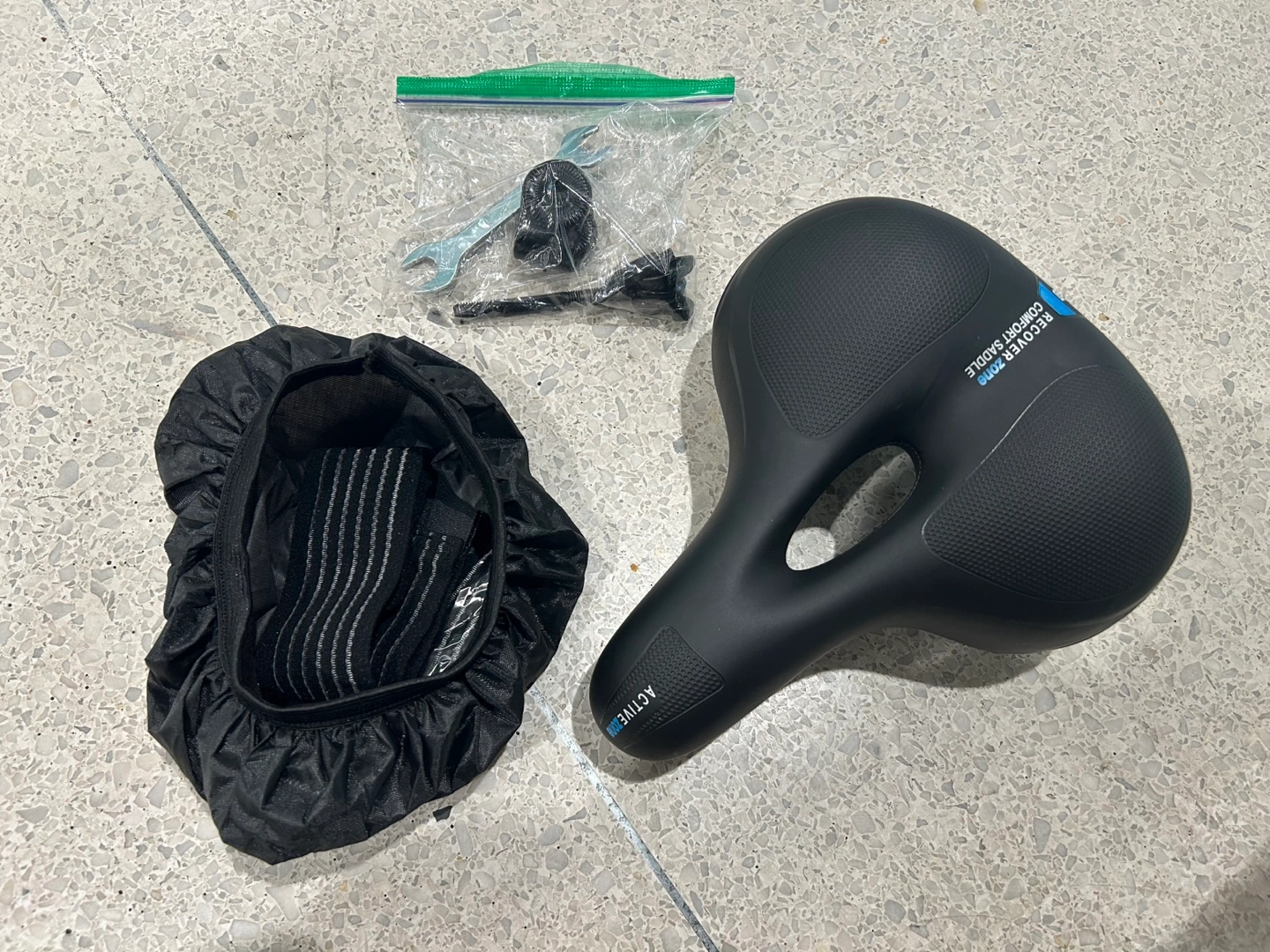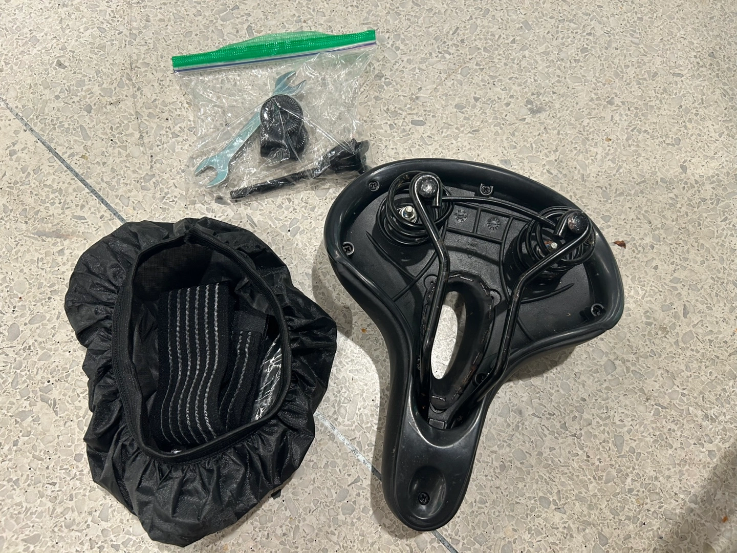 The bike seat is in good condition, comes with waterproof cover, tool and parts.