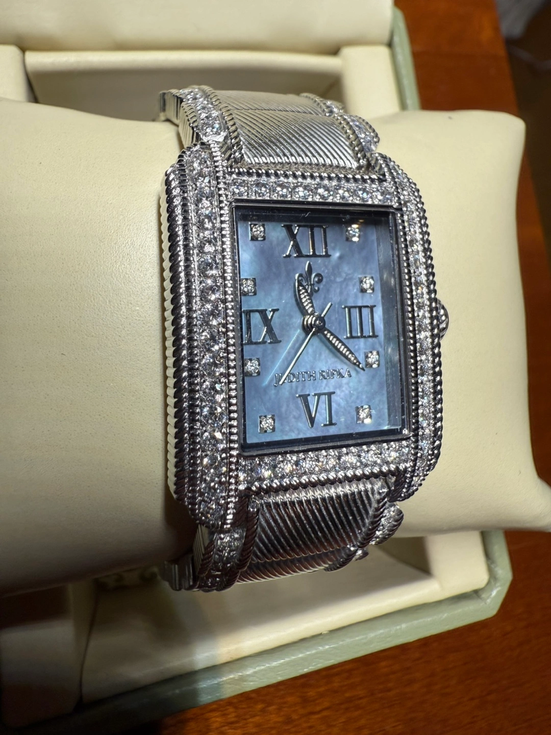 Selling for a family member. Originally purchased from The Shopping Channel (original price about $315). In new, unworn condition. Includes original box and papers. The original plastic peel wrap on the back of the watch is there there. New battery is required. Original box has damage, likely due to the glue no longer holding.