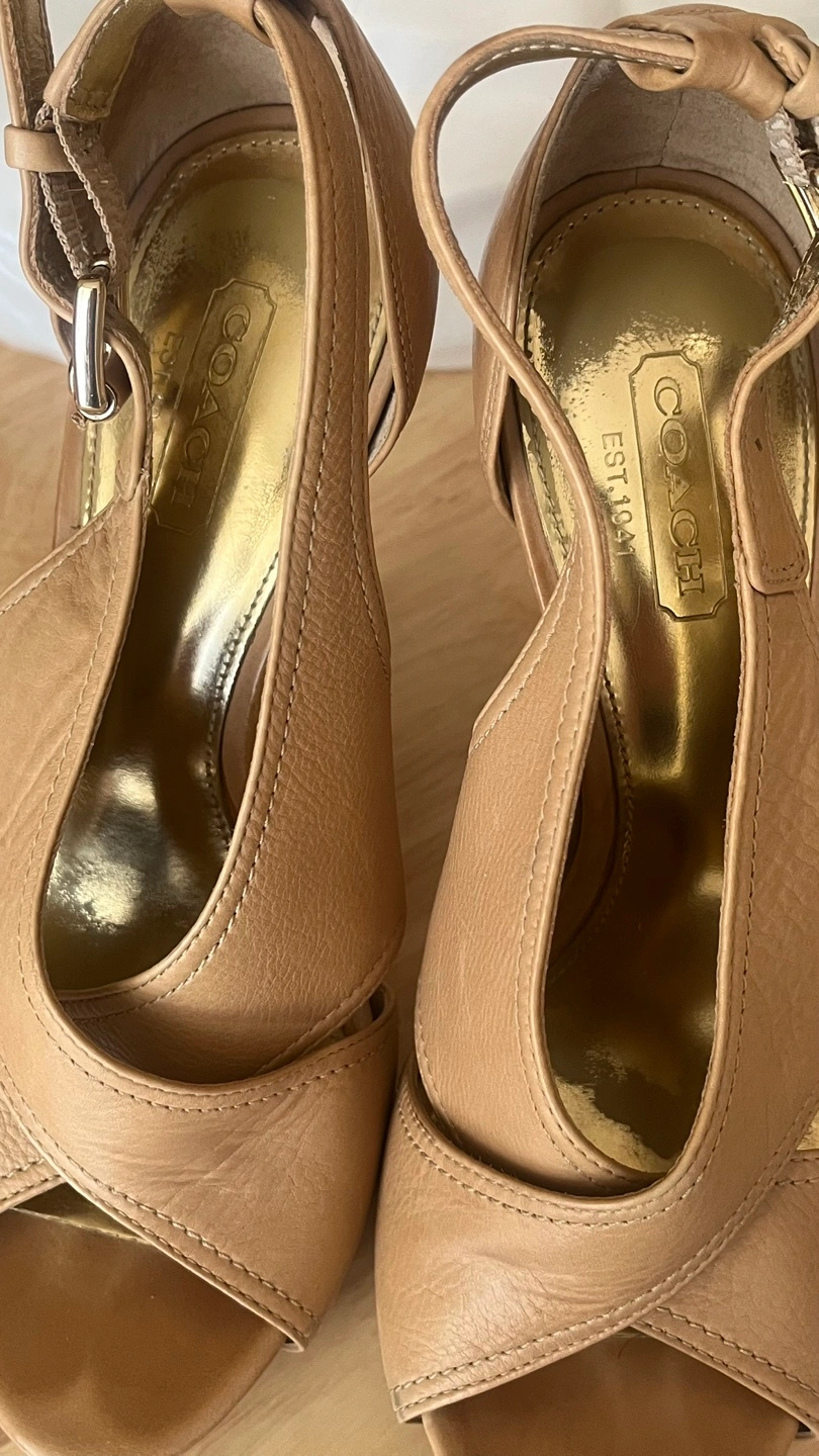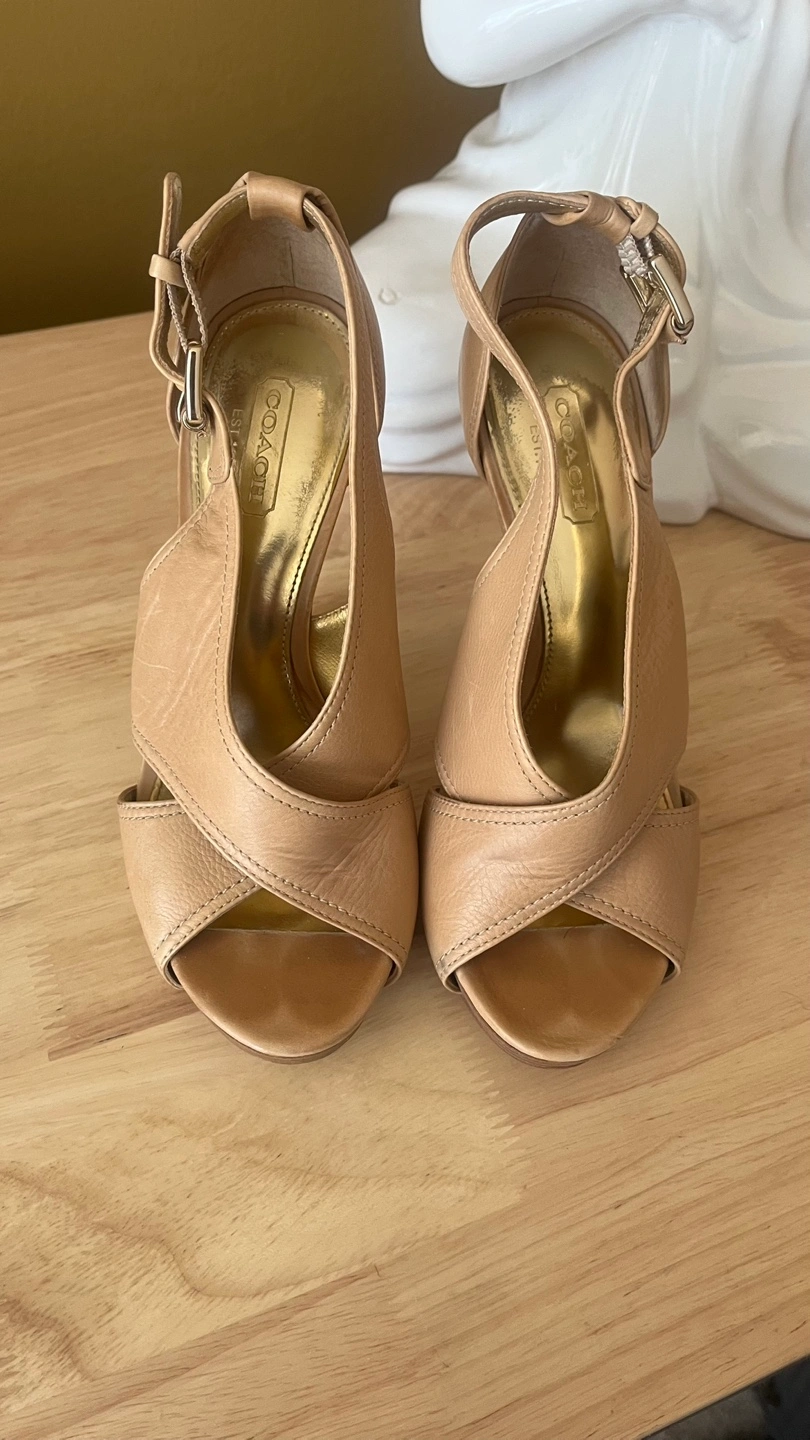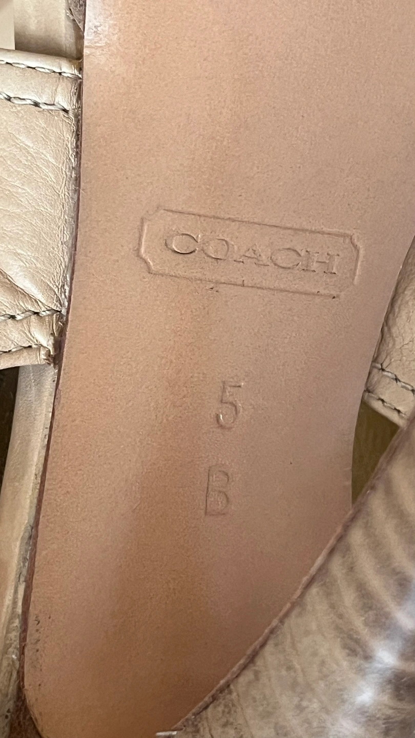 These Coach heels are a stylish addition to any wardrobe! They feature a beige leather upper and a classic heel design. Perfect for dressing up or down, these heels are sure to turn heads!