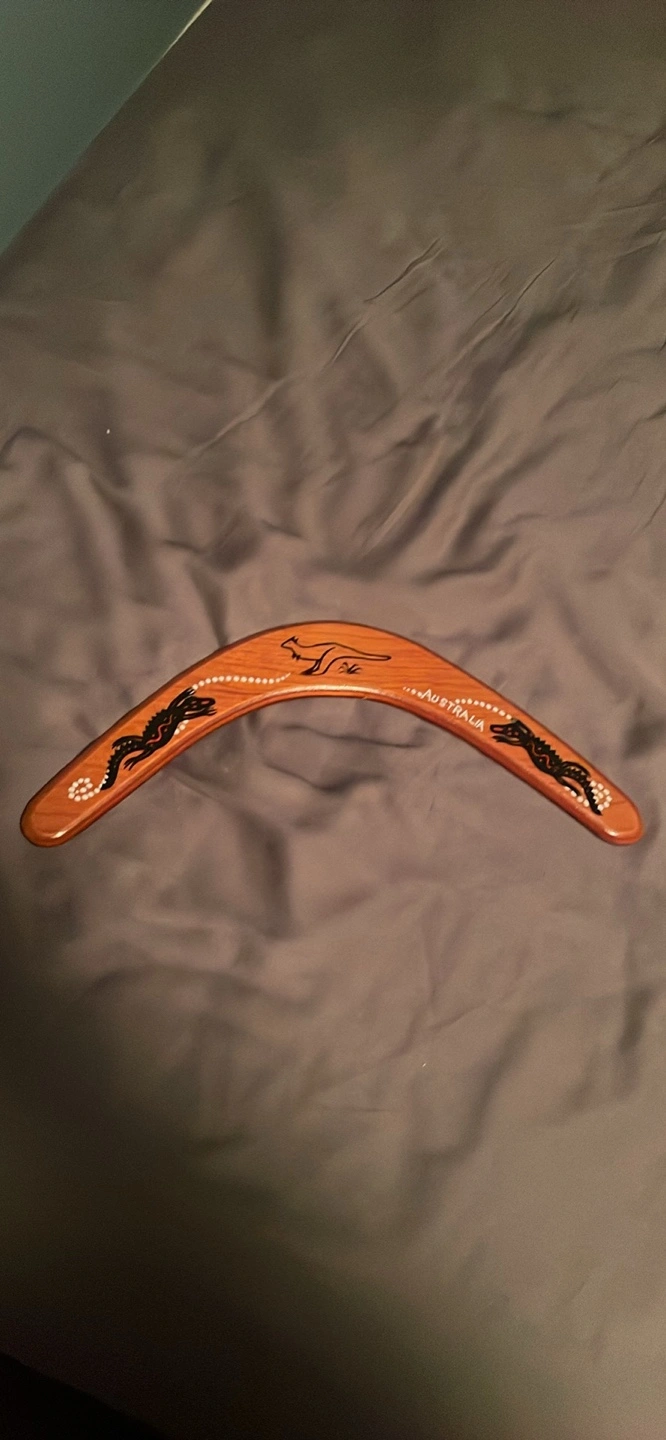 Selling a wooden boomerang with Australian aboriginal art. It has a kangaroo and lizard design. It says Australia.