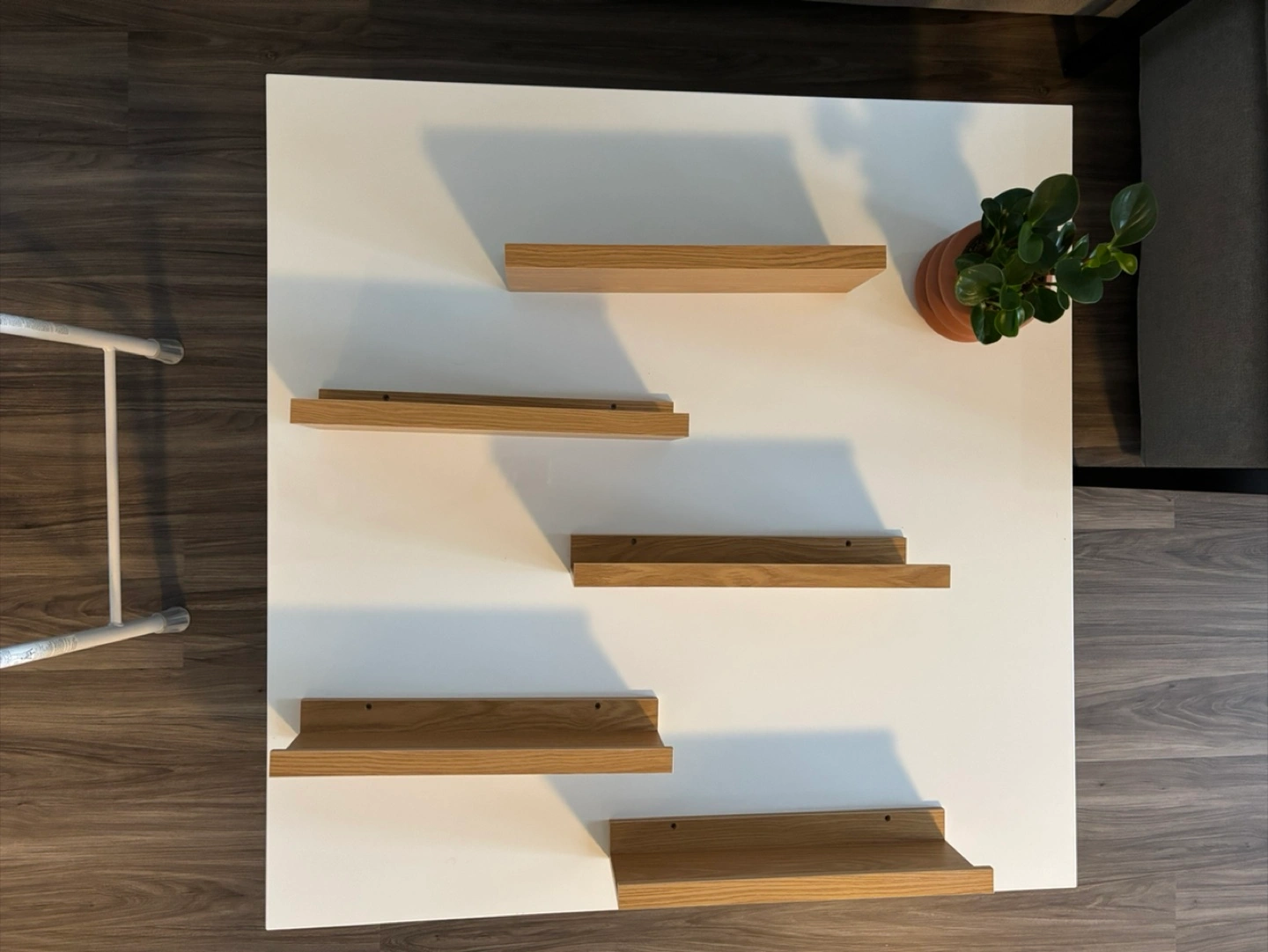 Selling a set of five wood wall shelves! They're in great shape and ready to add some display space to your home. Each shelf is 15.7 inches long, 5.12 inches deep, and 1.77 inches high. They're water-resistant and anti-scratch, plus they come with predrilled holes for easy installation