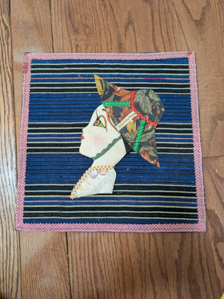 This is a unique, handmade wall hanging. The background has blue and black stripes with a pink lace trim. It's a beautiful piece to add some character to any room!