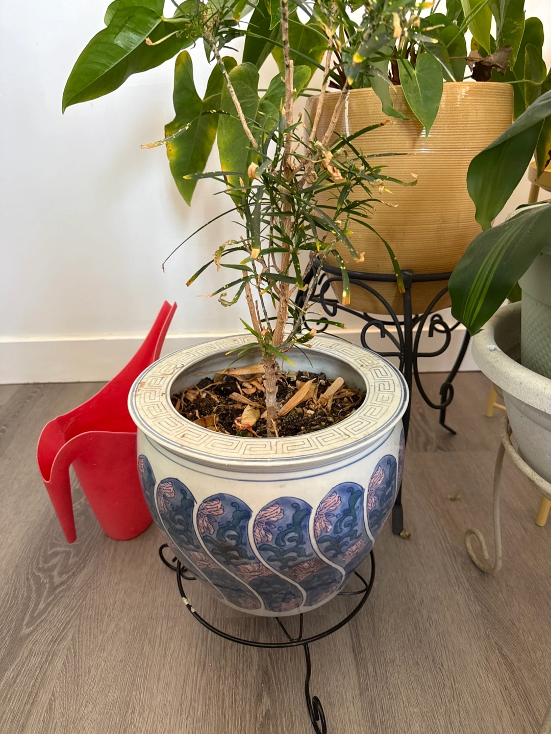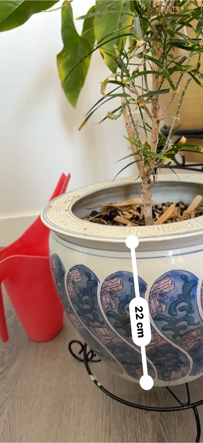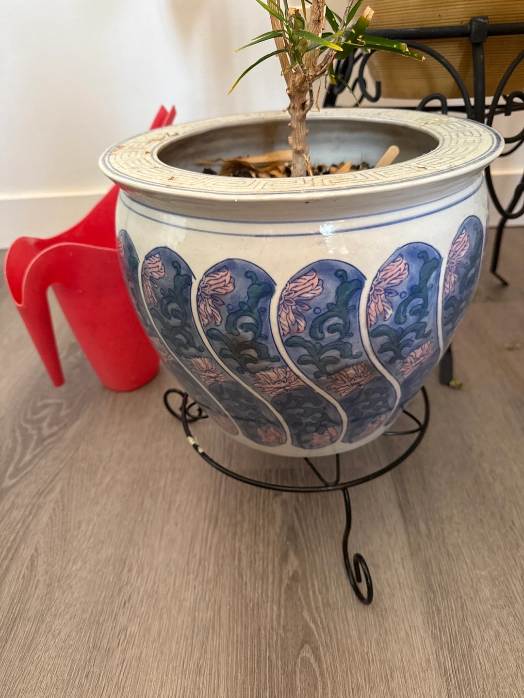 Selling a lovely decorative plant pot, perfect for adding a touch of elegance to your home or garden! It comes with a sturdy metal stand. The pot features a beautiful blue and white floral design. Approximate dimensions are 22cm in height and 27cm in diameter