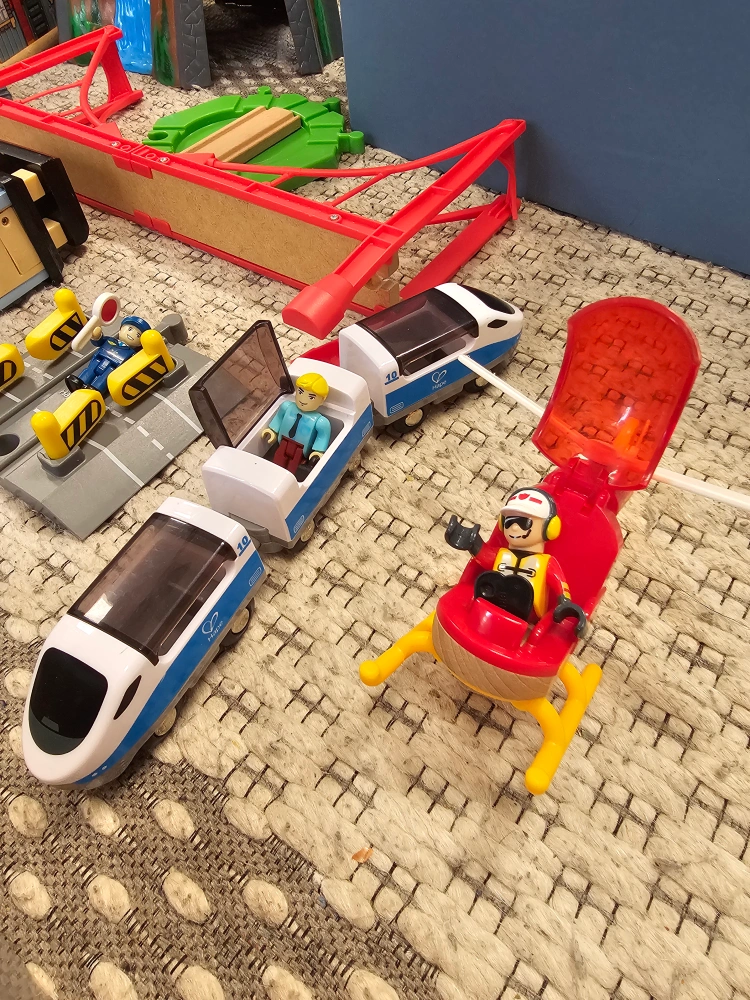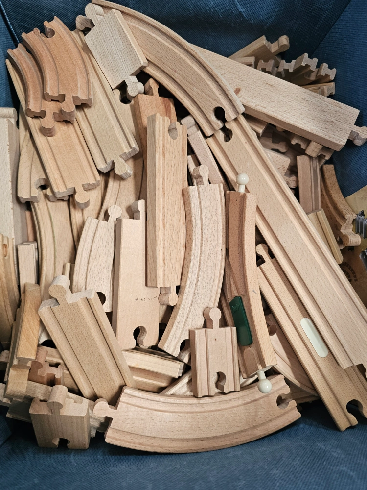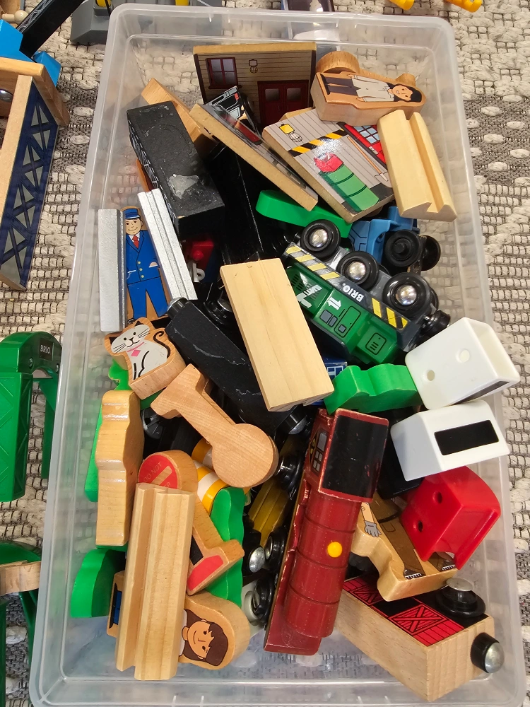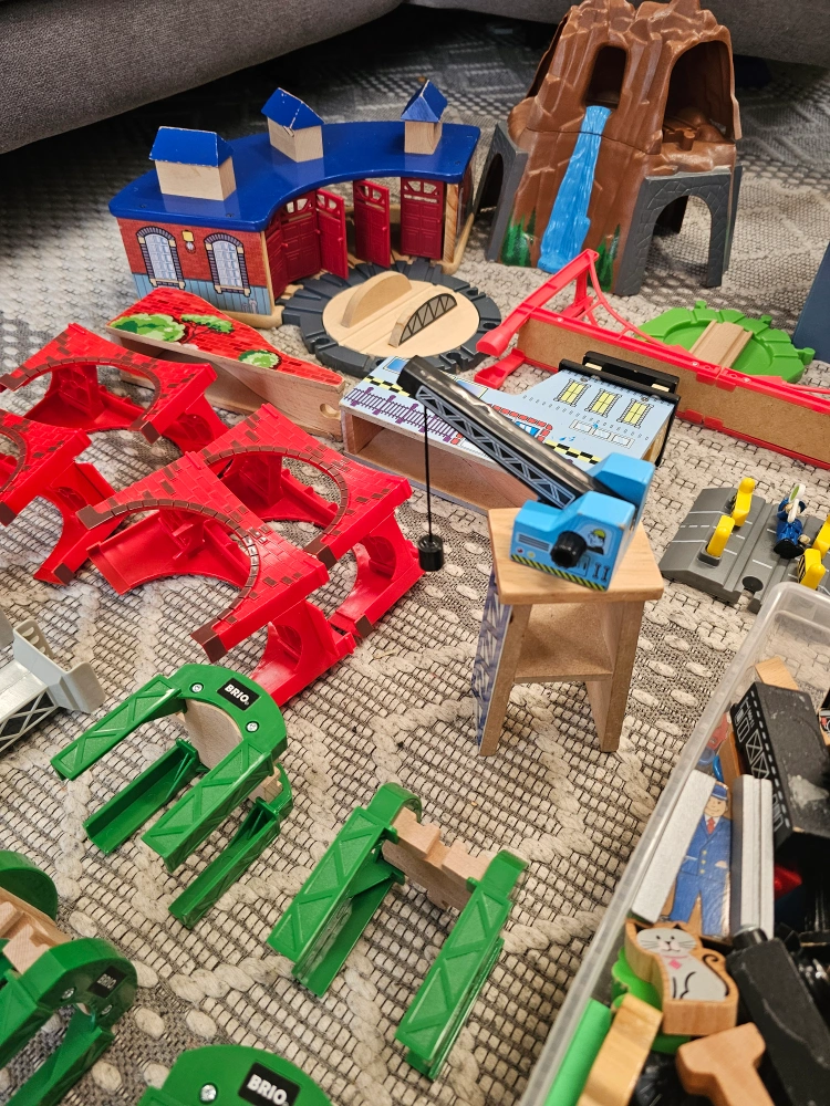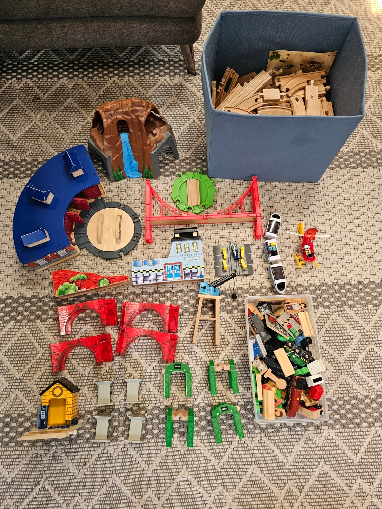 Selling a large mix of BRIO, Hape, and other wooden railway set. Includes a variety of tracks, trains, bridges, and accessories for hours of creative play. Great for kids who love trains and building!
