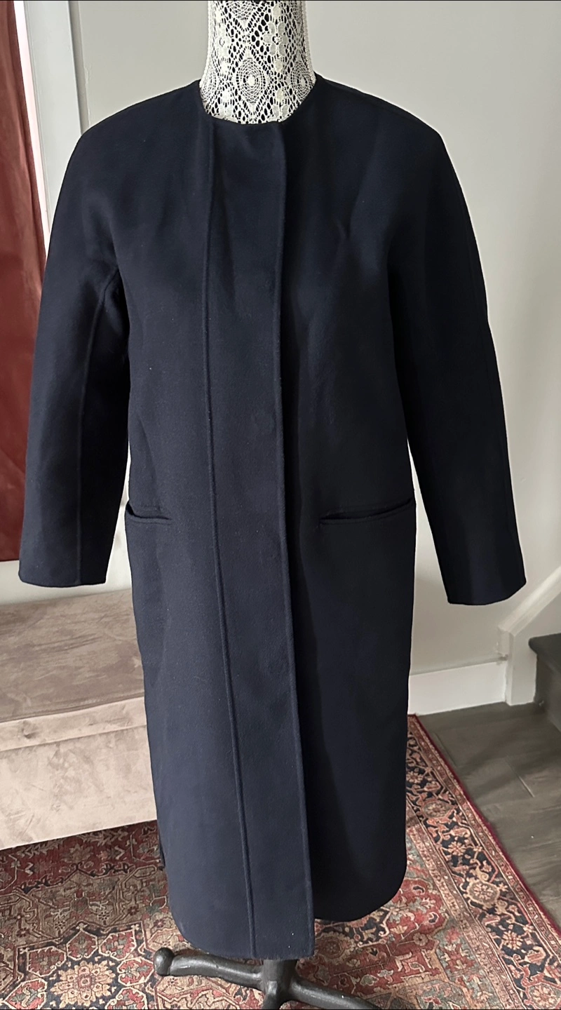 292Selling a stylish Massimo Dutti wool coat in navy. It's in great condition and perfect for the cooler weather. The coat is made of high-quality wool, ensuring warmth and comfort. A classic piece that will elevate any outfit!