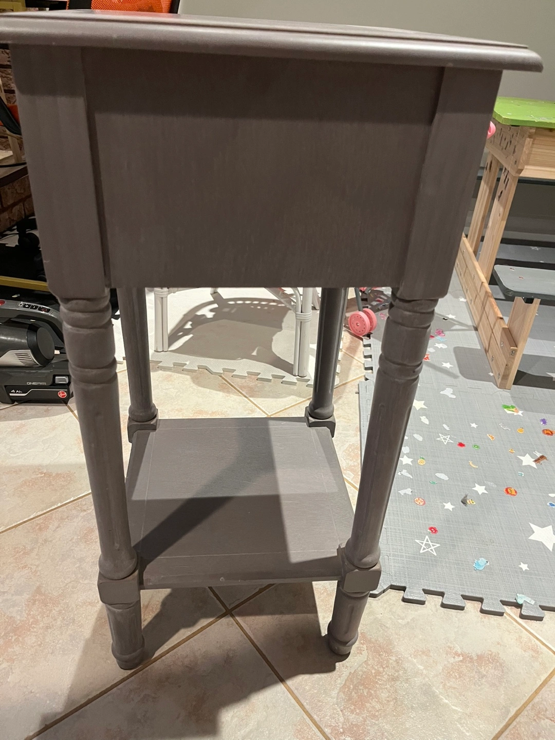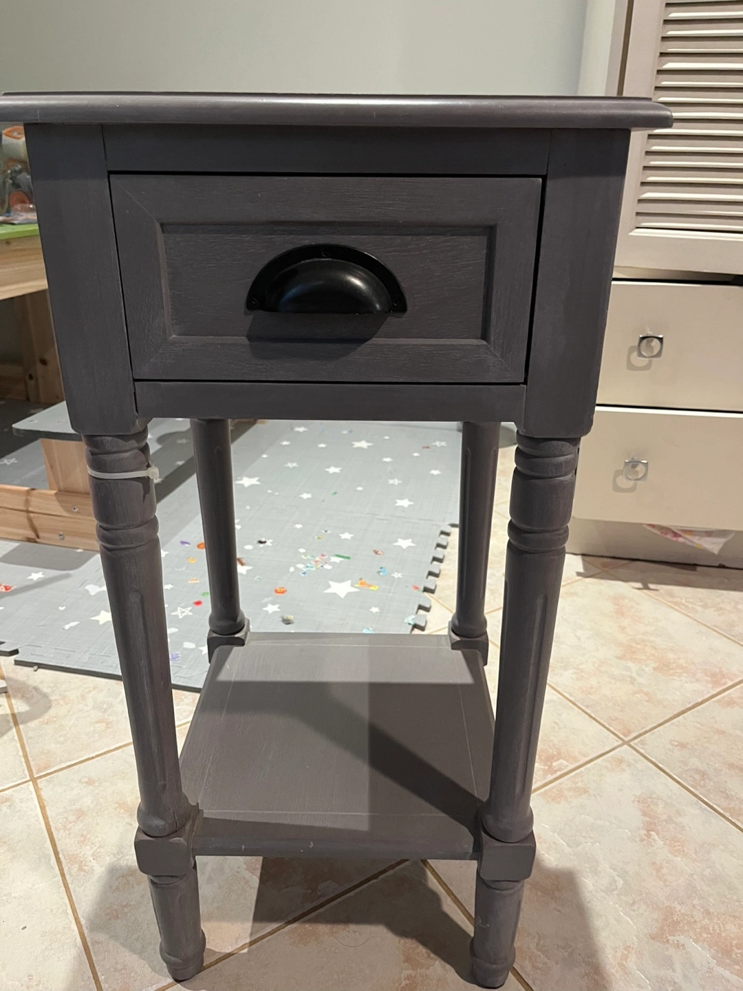 Selling a cute grey nightstand! It has a drawer and a shelf at the bottom for extra storage. Perfect for a bedside table or as a small accent piece in any room