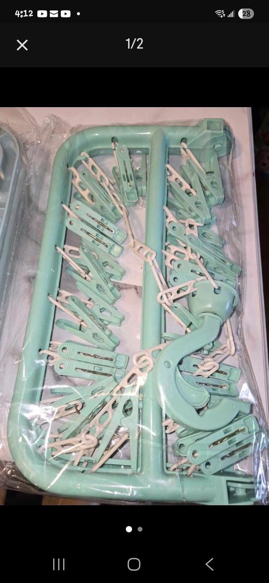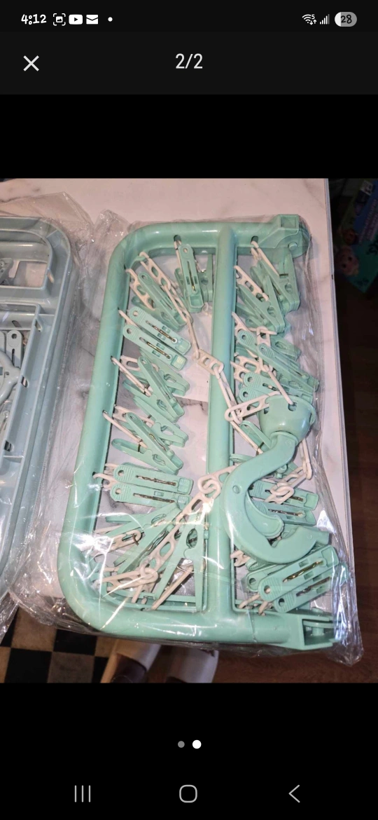 Here's a handy mint green clothes drying rack! It comes with lots of clips, perfect for socks, lingerie, or small items. It's in great shape and ready to help you save on dryer time!✨️👋🏾
