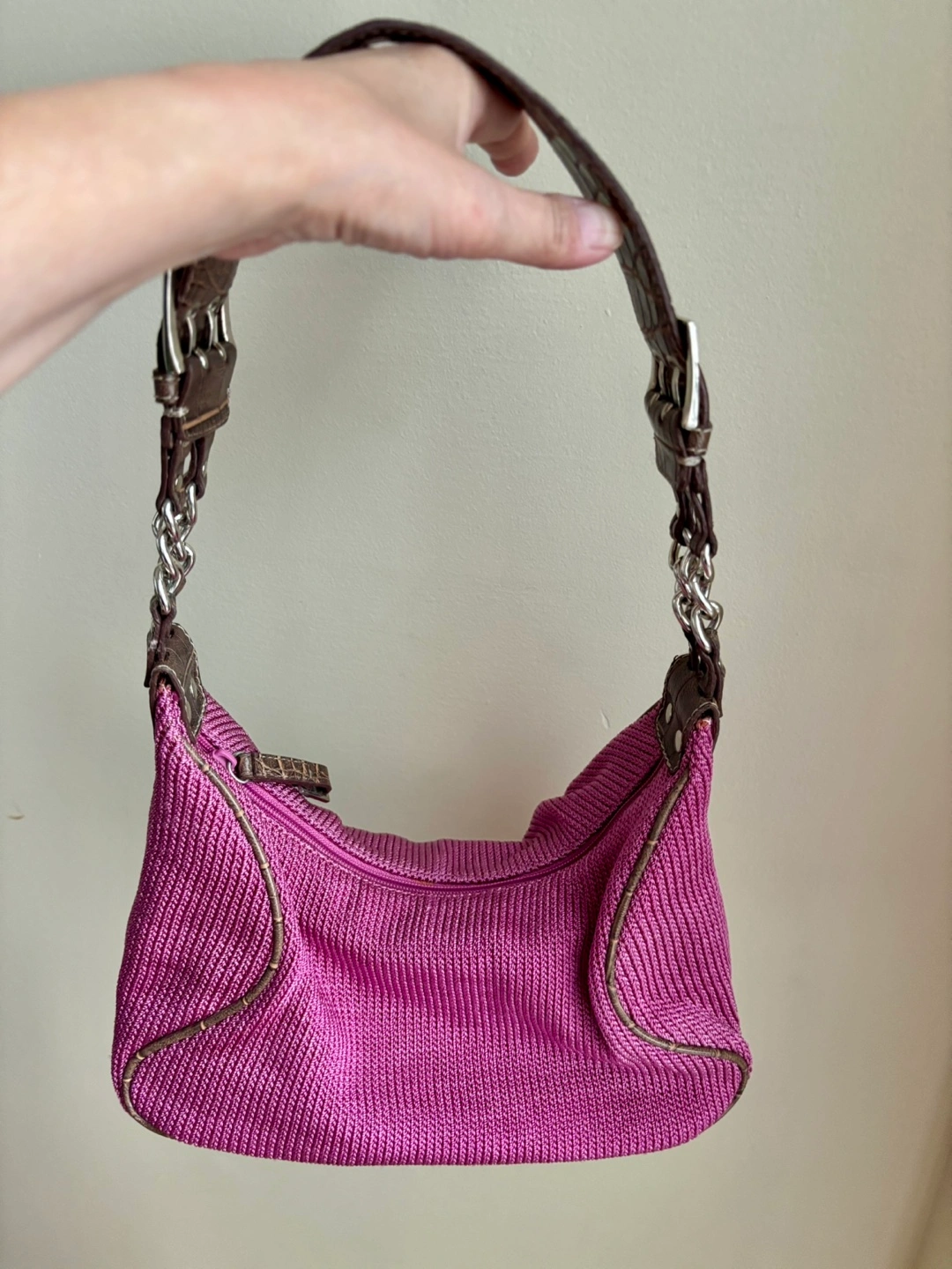 218Cute Sak shoulder bag in a vibrant pink! It's in great condition and features a unique design with a brown crocodile-print handle and silver chain detailing. Perfect for adding a pop of colour to your outfit! Cash only price firm.
