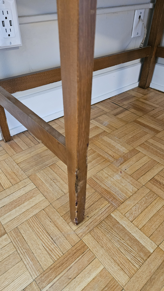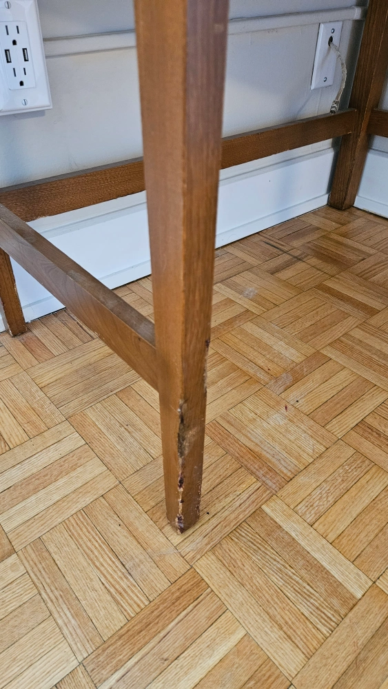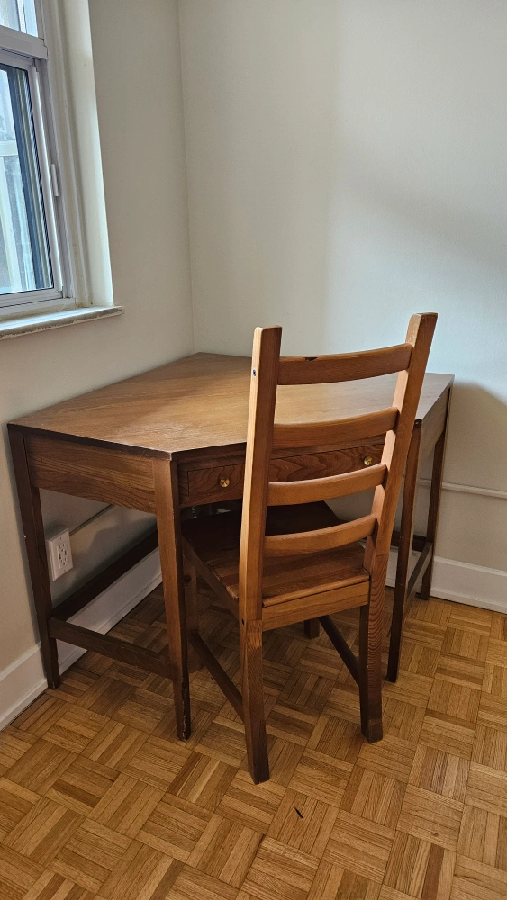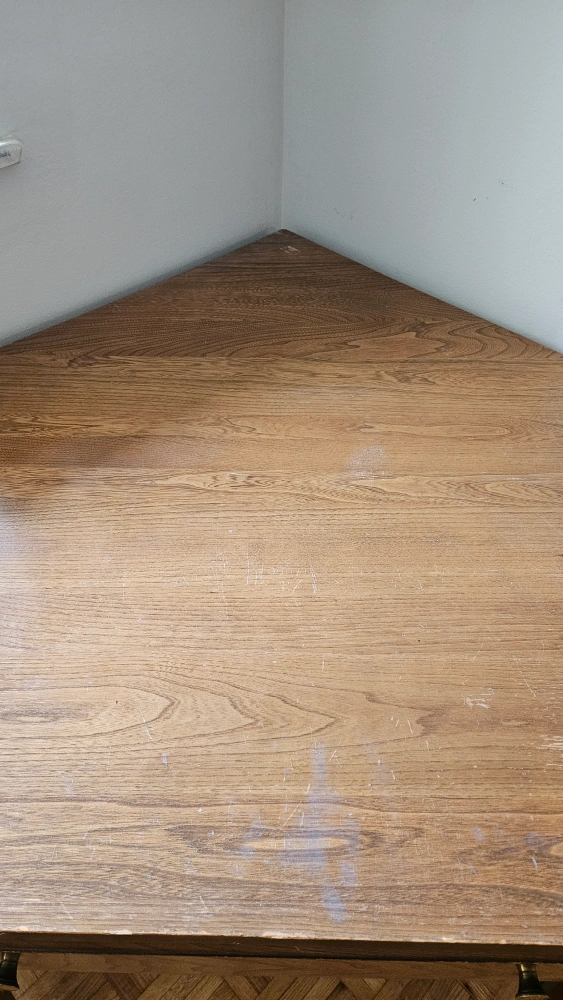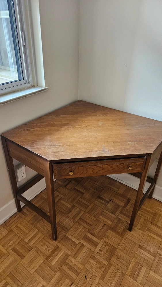 Selling a wooden corner desk, perfect for a small space! It features a drawer for storage. There are some signs of wear on the legs and on the top, as shown in the photos.