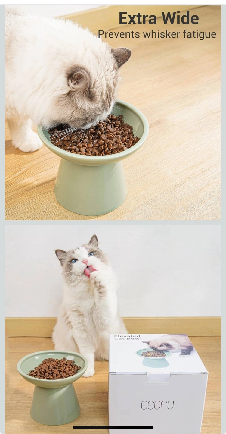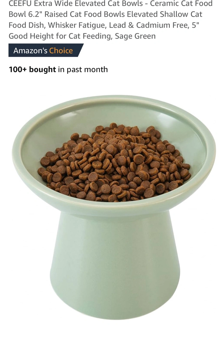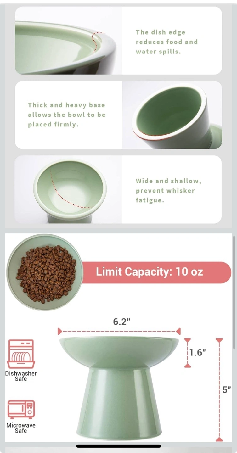 This CEEPU cat bowl is designed to prevent whisker fatigue with its extra-wide and shallow design! It's ceramic, lead & cadmium free, and stands 5" tall. The dish edge helps reduce food and water spills. The thick and heavy base allows the bowl to be placed firmly. It can hold up to 10 oz of food or water and is both dishwasher and microwave safe