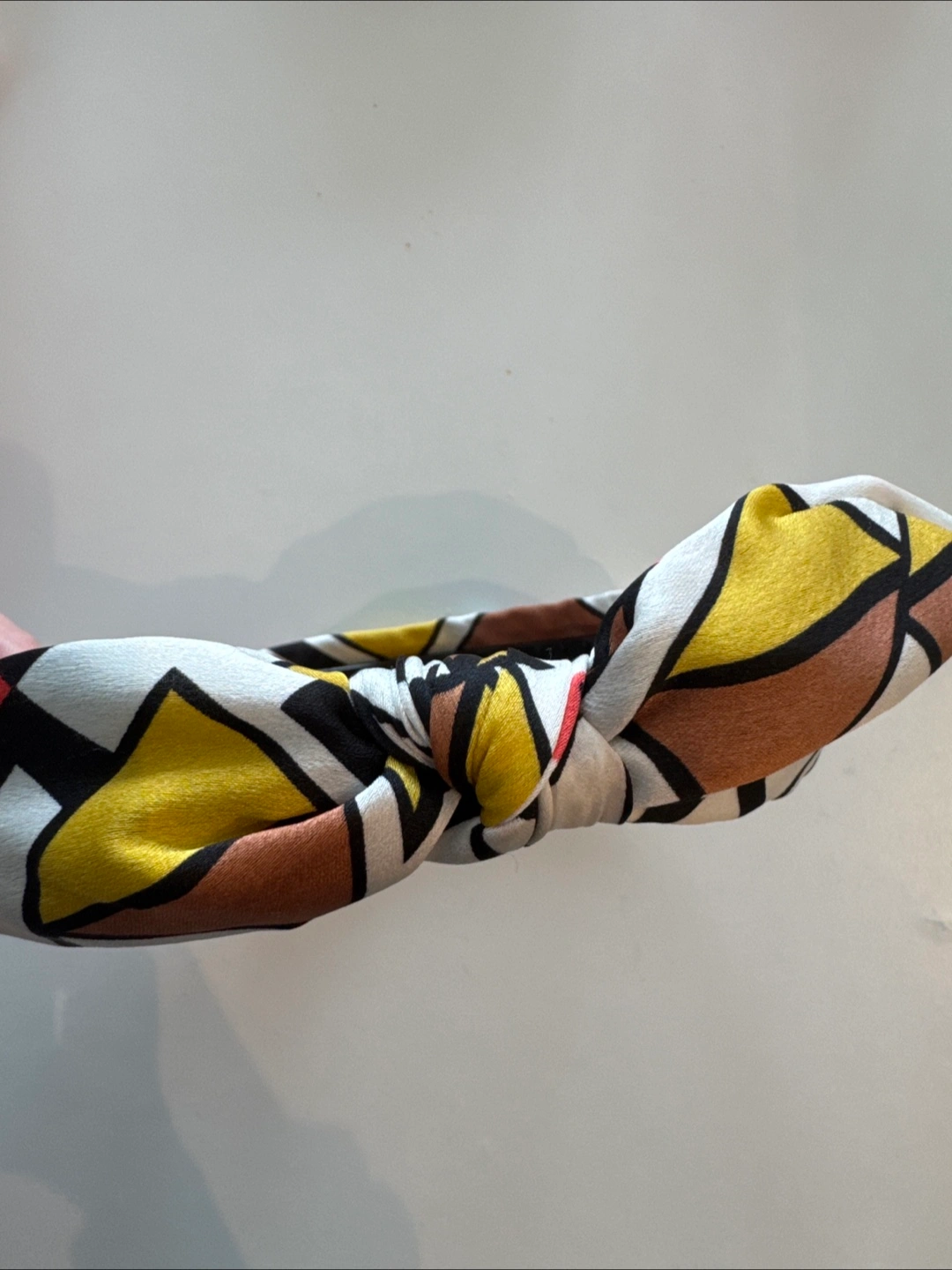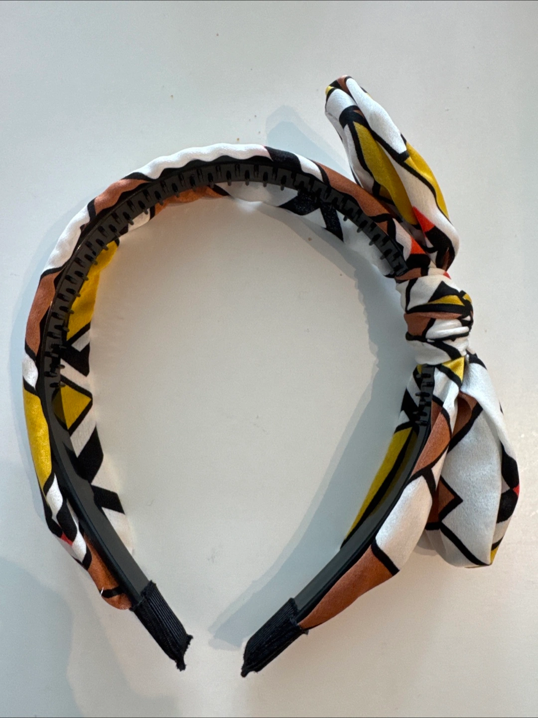 793Here's a cute headband with a bow! It features a unique geometric pattern with colours like white, brown, yellow, and black. Perfect for adding a little flair to any outfit