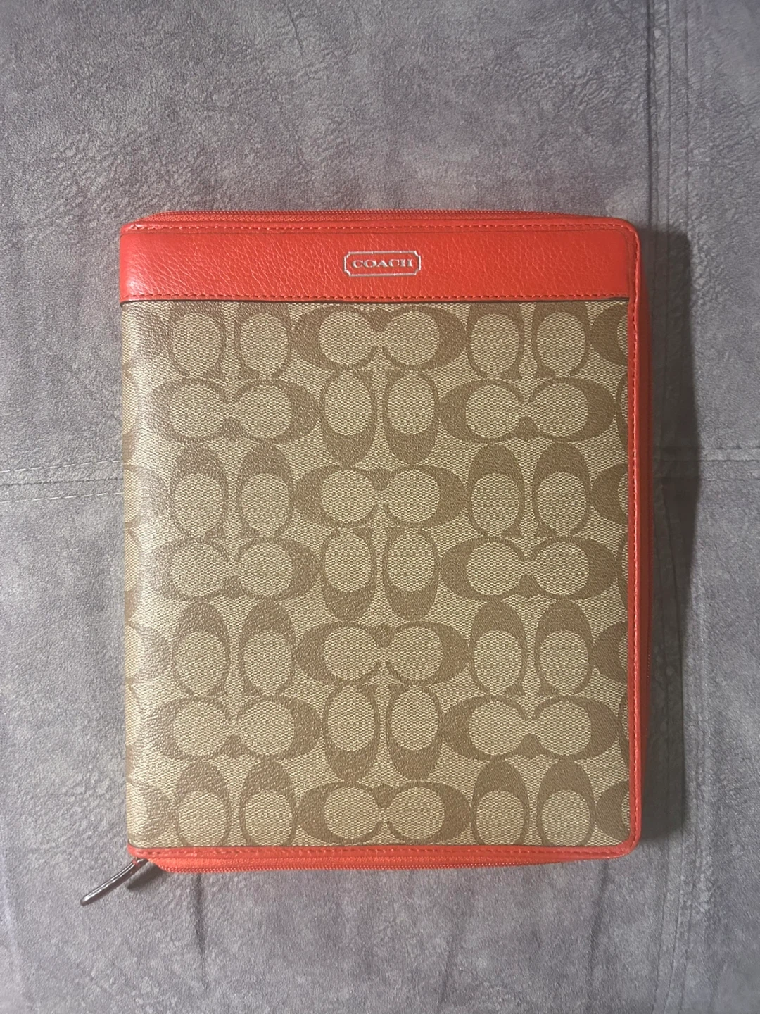 This is a Coach tablet case featuring the signature C pattern in tan and brown with bright orange leather trim. It zips open to reveal a vibrant orange interior with a slot for a tablet and a strap to secure it. It's perfect for protecting your device in style!