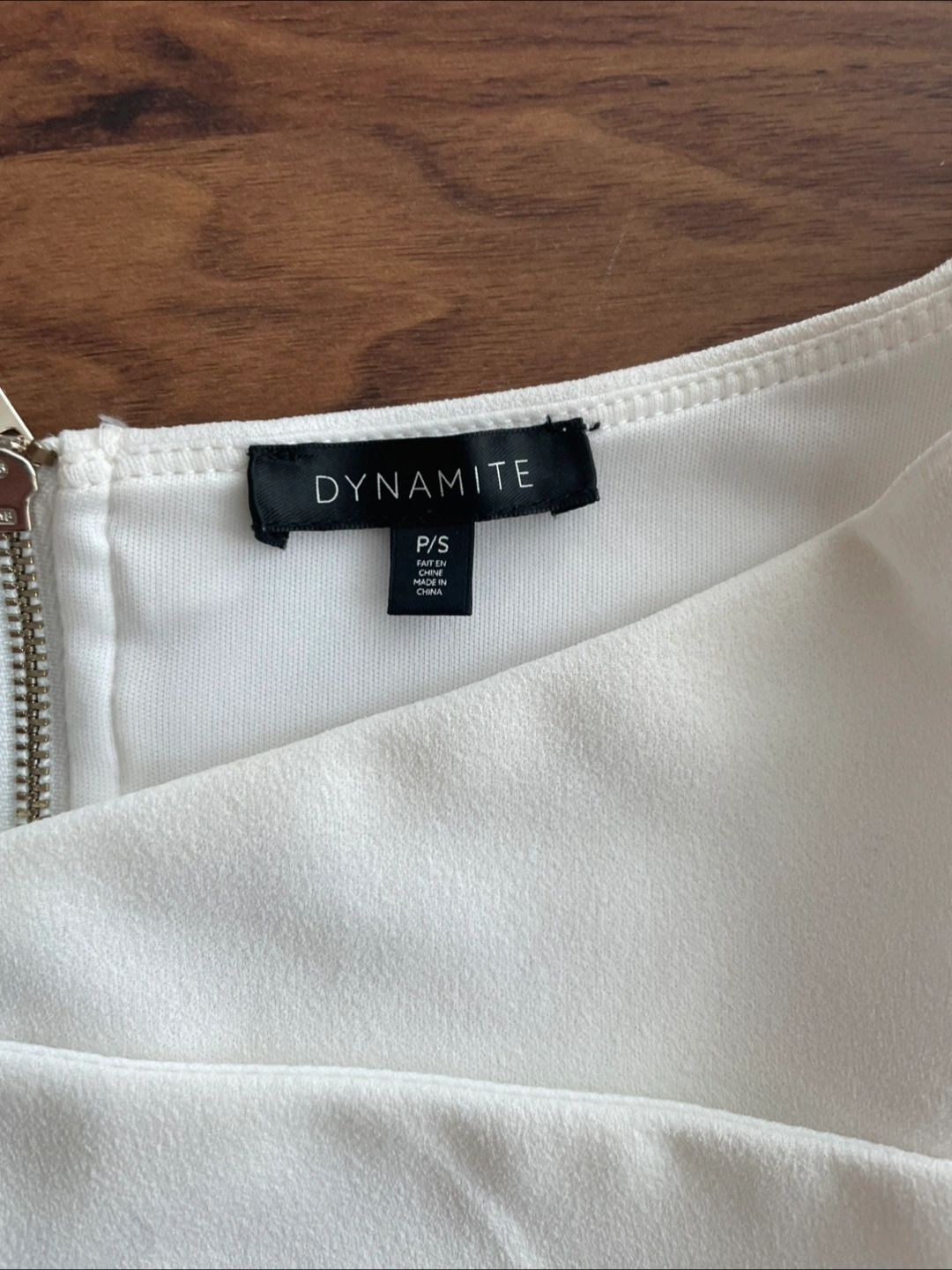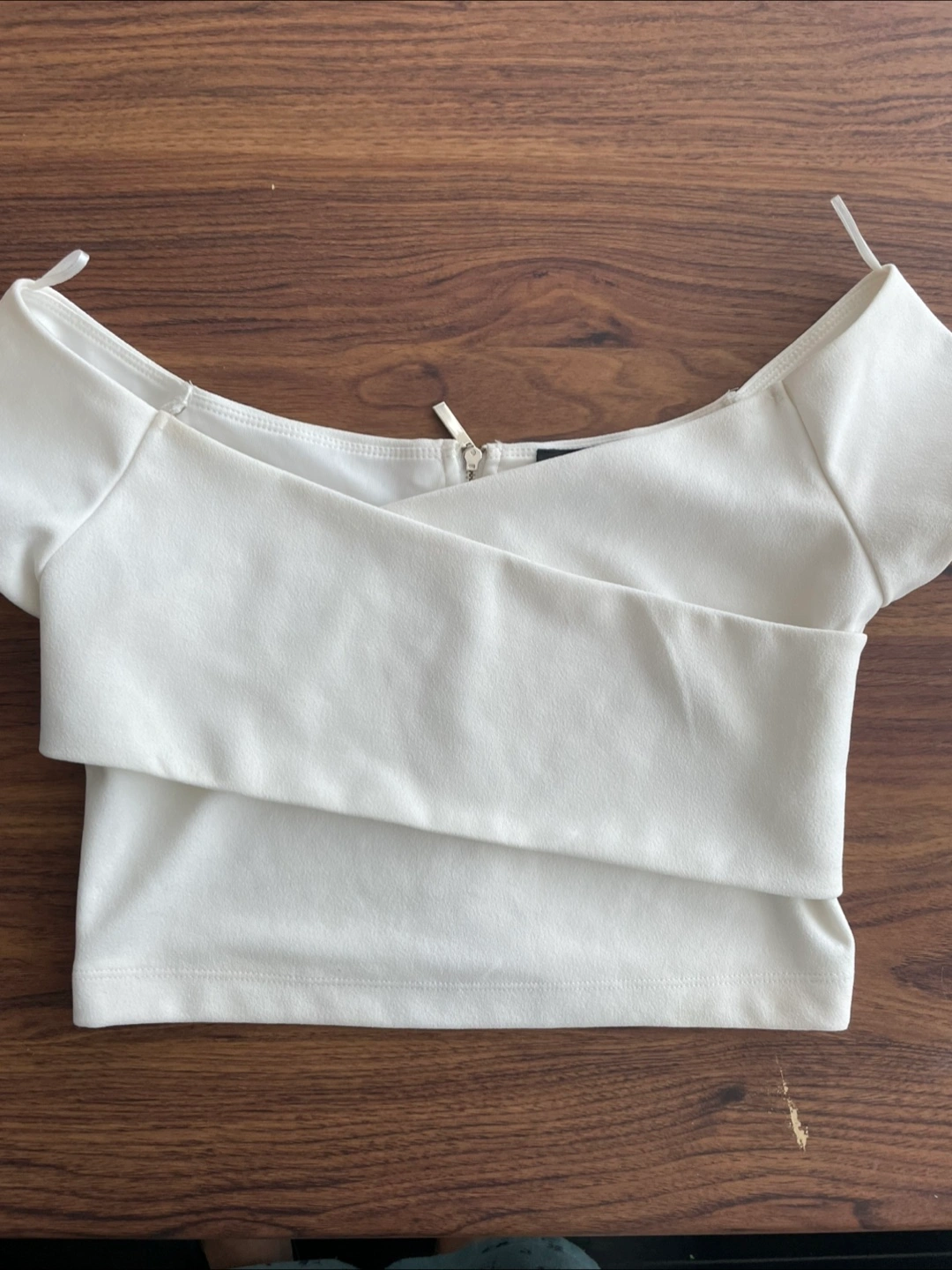 Selling a cute white crop top from Dynamite! It's a size P/S (Petite/Small) and in great condition. Perfect for a night out or dressing up a casual outfit. It features a zipper in the back.