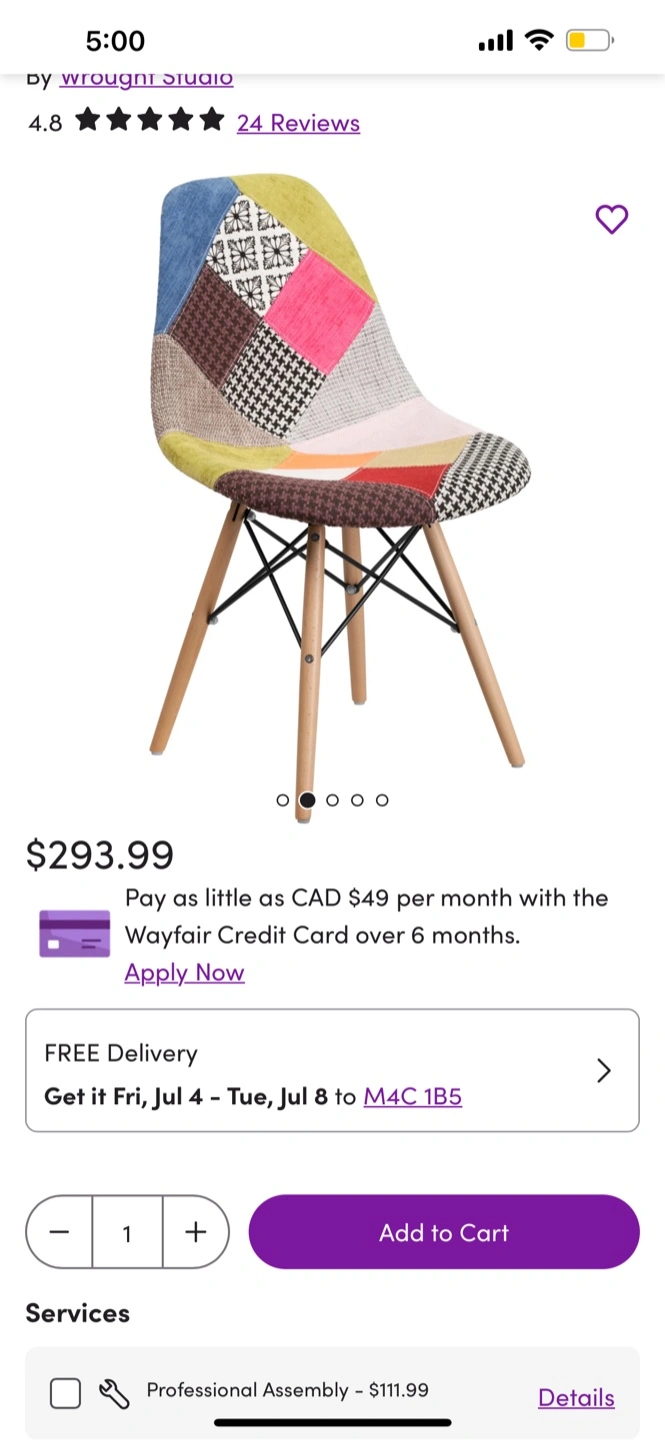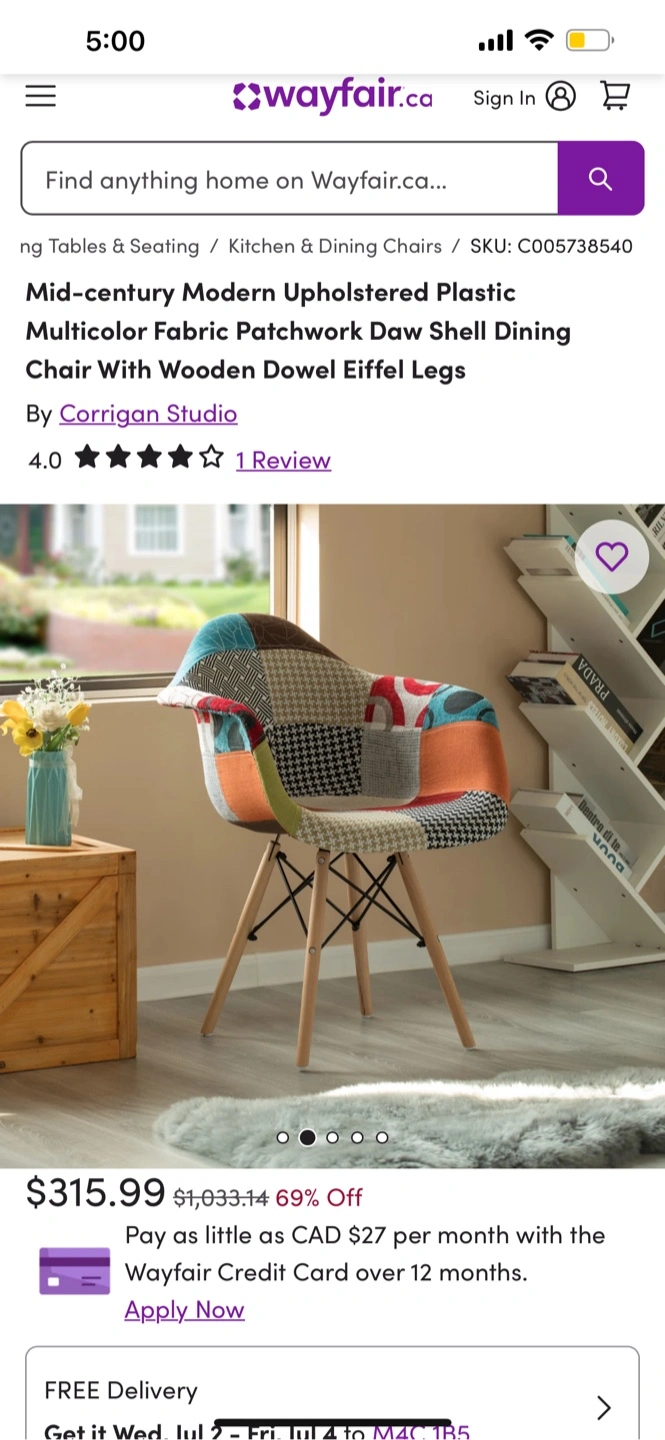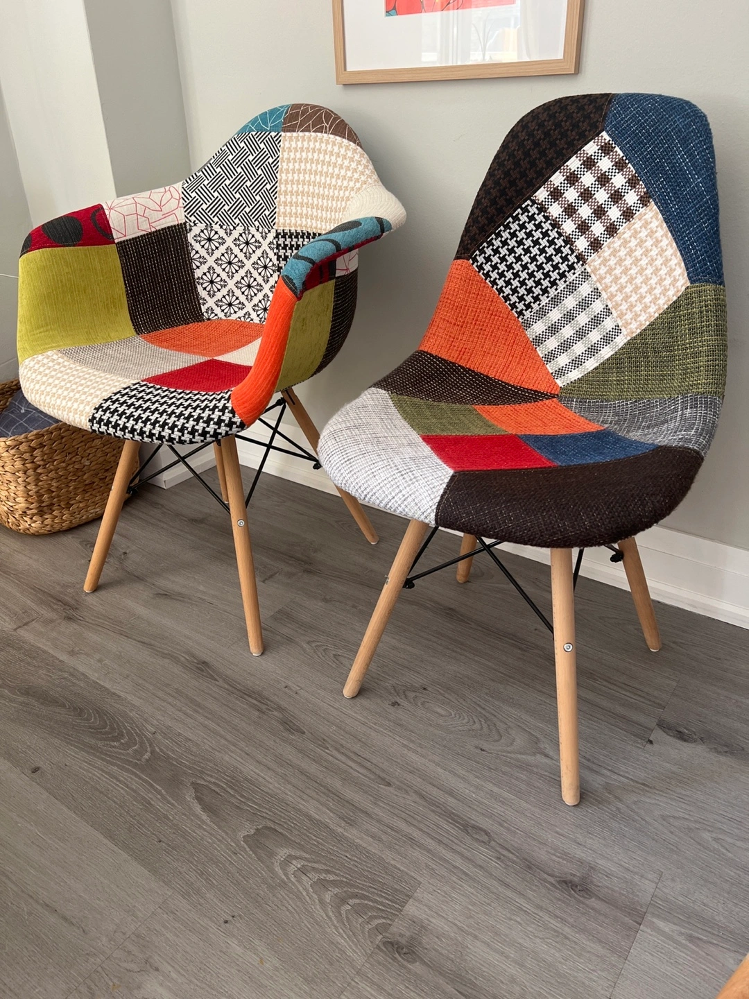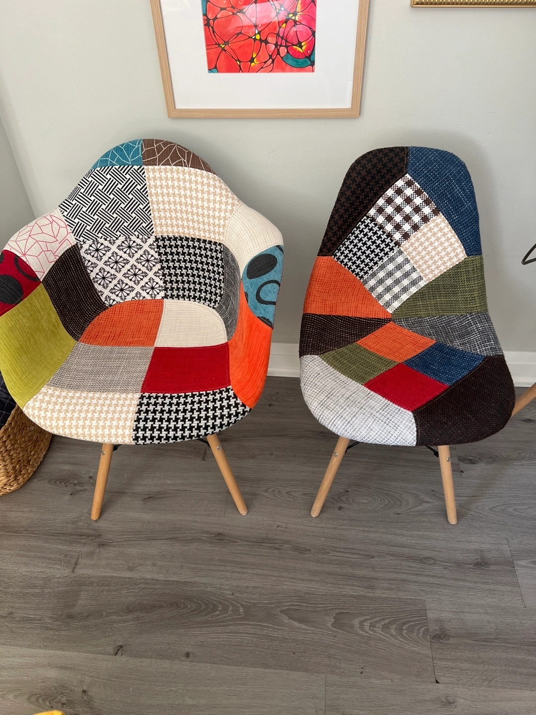 Selling a set of two dining chairs! Barely used. From very clean, smoke free and pet free household. These chairs feature a unique patchwork design with a mix of colours and patterns. The legs are made of wood and are held by metal construct. For current original prices see screenshots from Wayfair. Can sell separately. Pictures are not brushed up to avoid any misrepresentation. I also have a while table for this set if anyone will show interest.