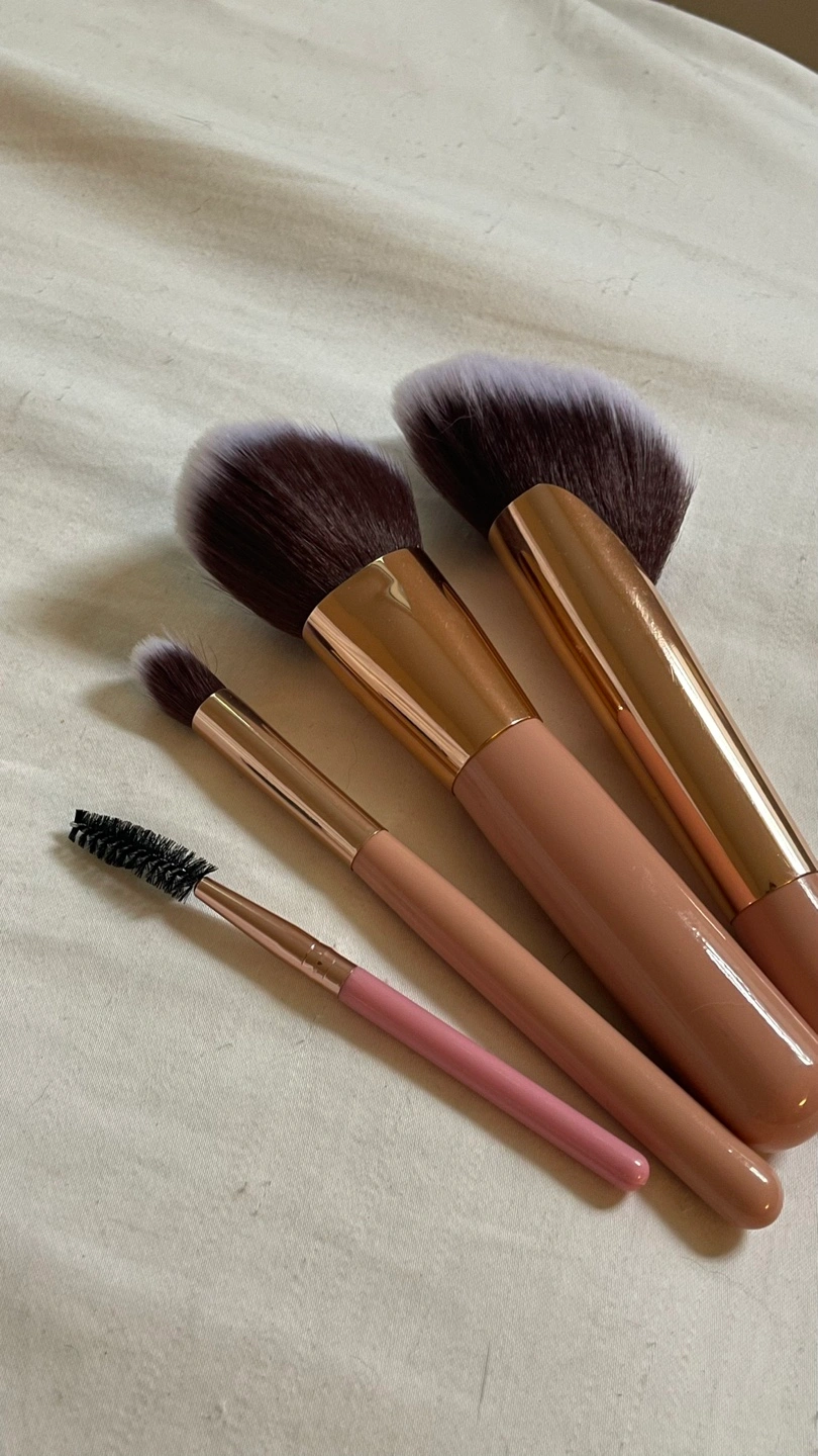 Set of 4 mini makeup brushes. In good condition, perfect for applying foundation, blush, eyeshadow, and eyebrows.