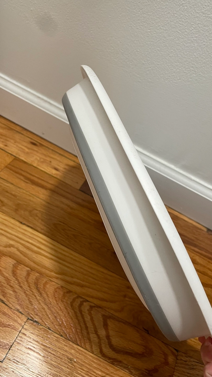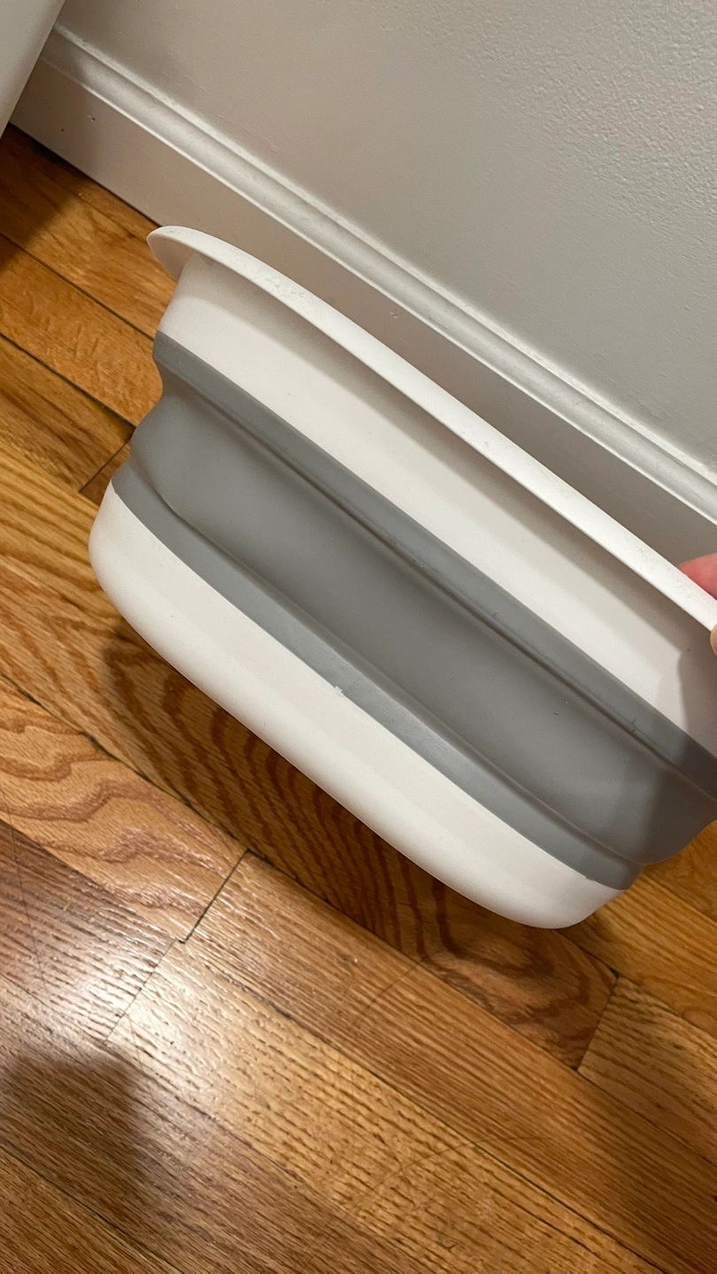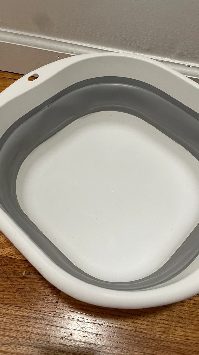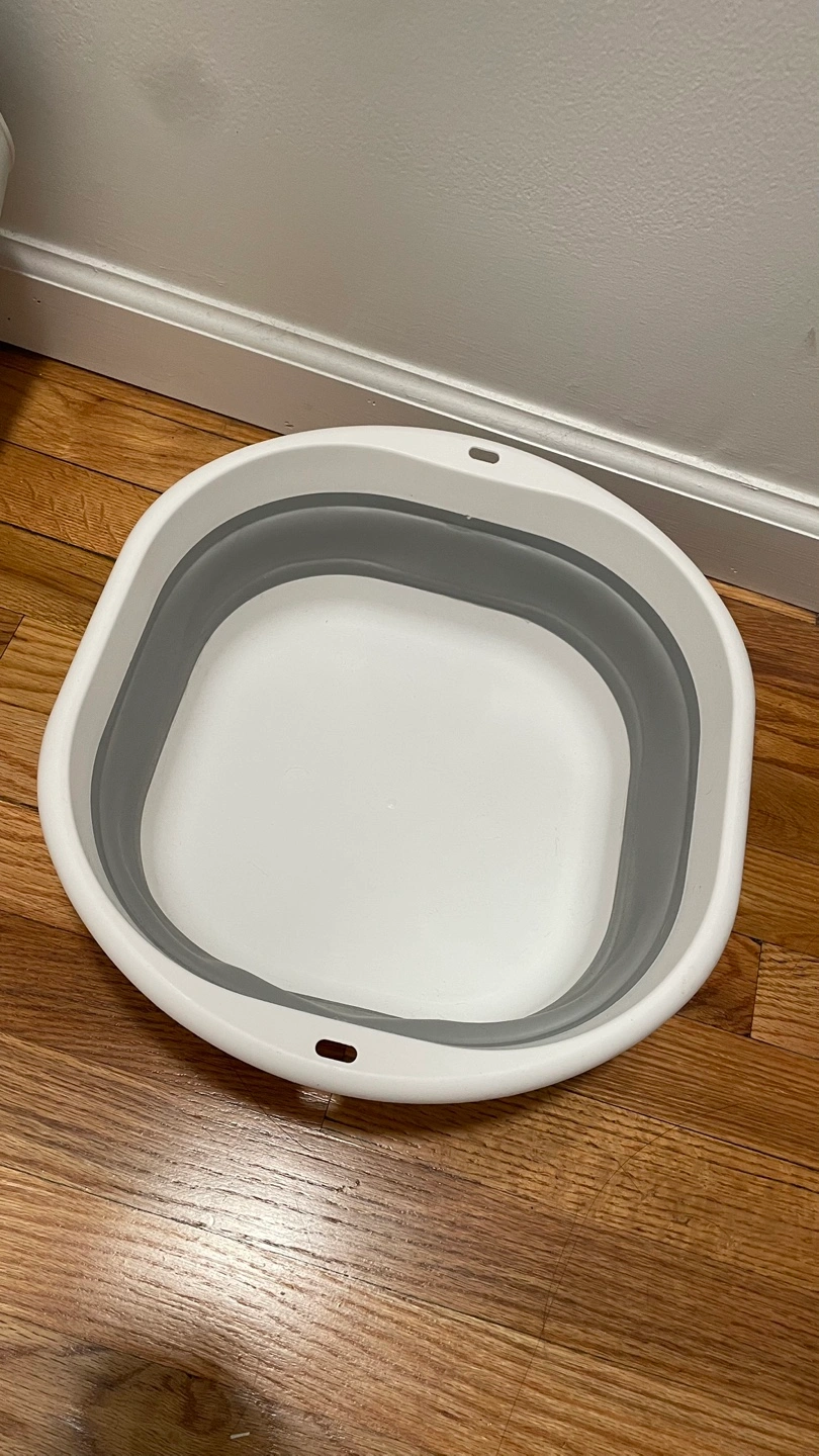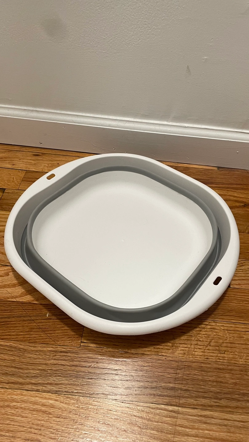 Collapsible tub/basin, perfect for camping or small spaces. White and gray silicone, in great condition. It can be used as a portable basin for washing dishes or handwashing clothes.