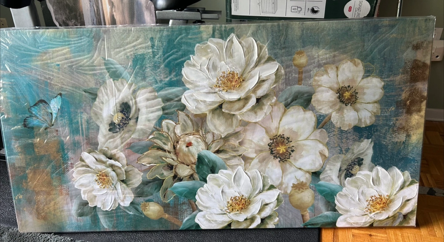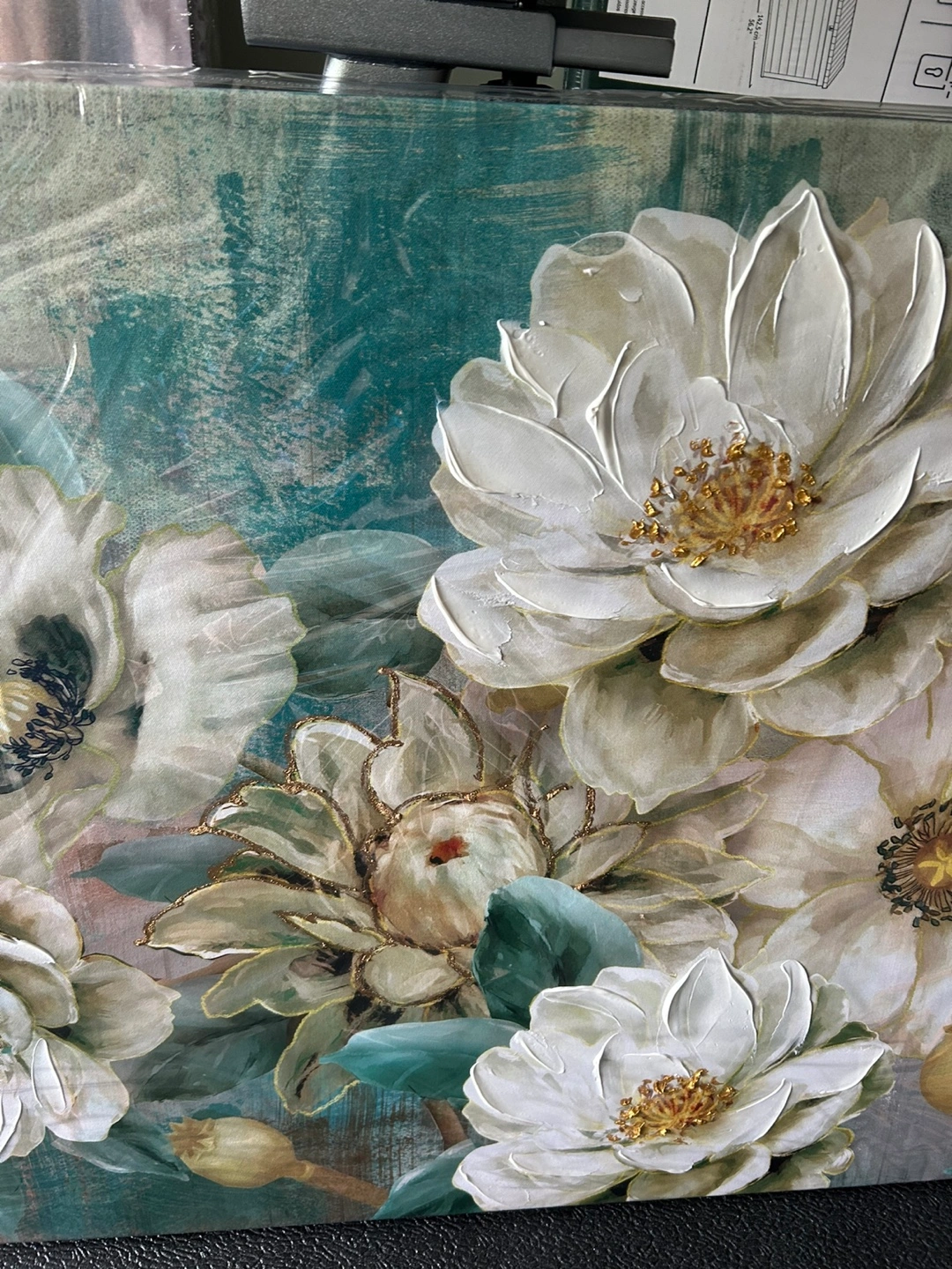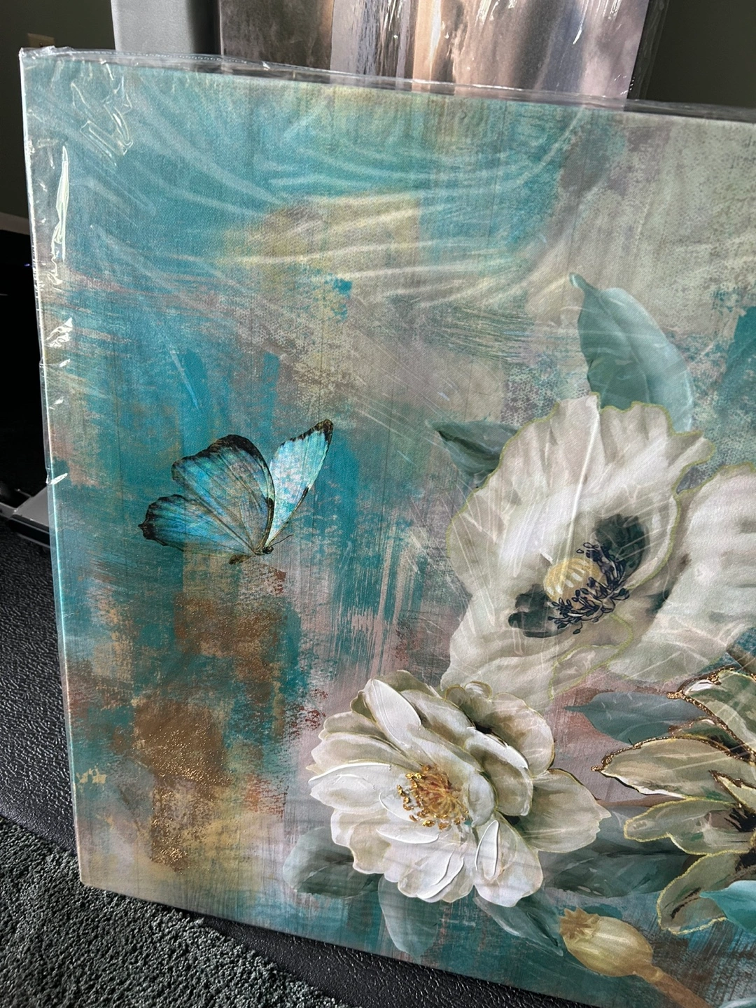 284Brand new floral wall art. Featuring a stunning butterfly and raised/textured flower design with gorgeous detailing. A lovely piece to brighten up any room. Dimensions: 30 inches high by 60 inches high Price as stated.