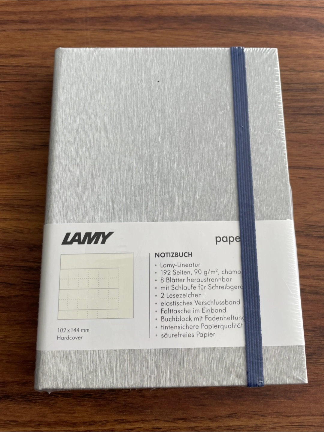 575Selling a Lamy notebook with a hardcover in A6 size. The colour is ocean blue. It features Lamy ruling, 90 g/m² ivory paper, and 8 perforated sheets. It also has 2 ribbon markers, an elastic band, a back paper pocket, and thread stitching on the inside. It's acid-free paper too!