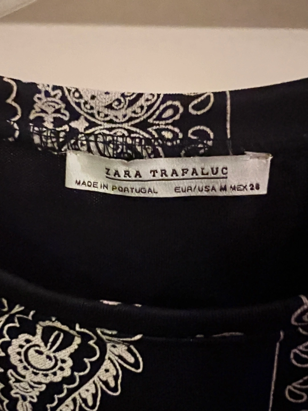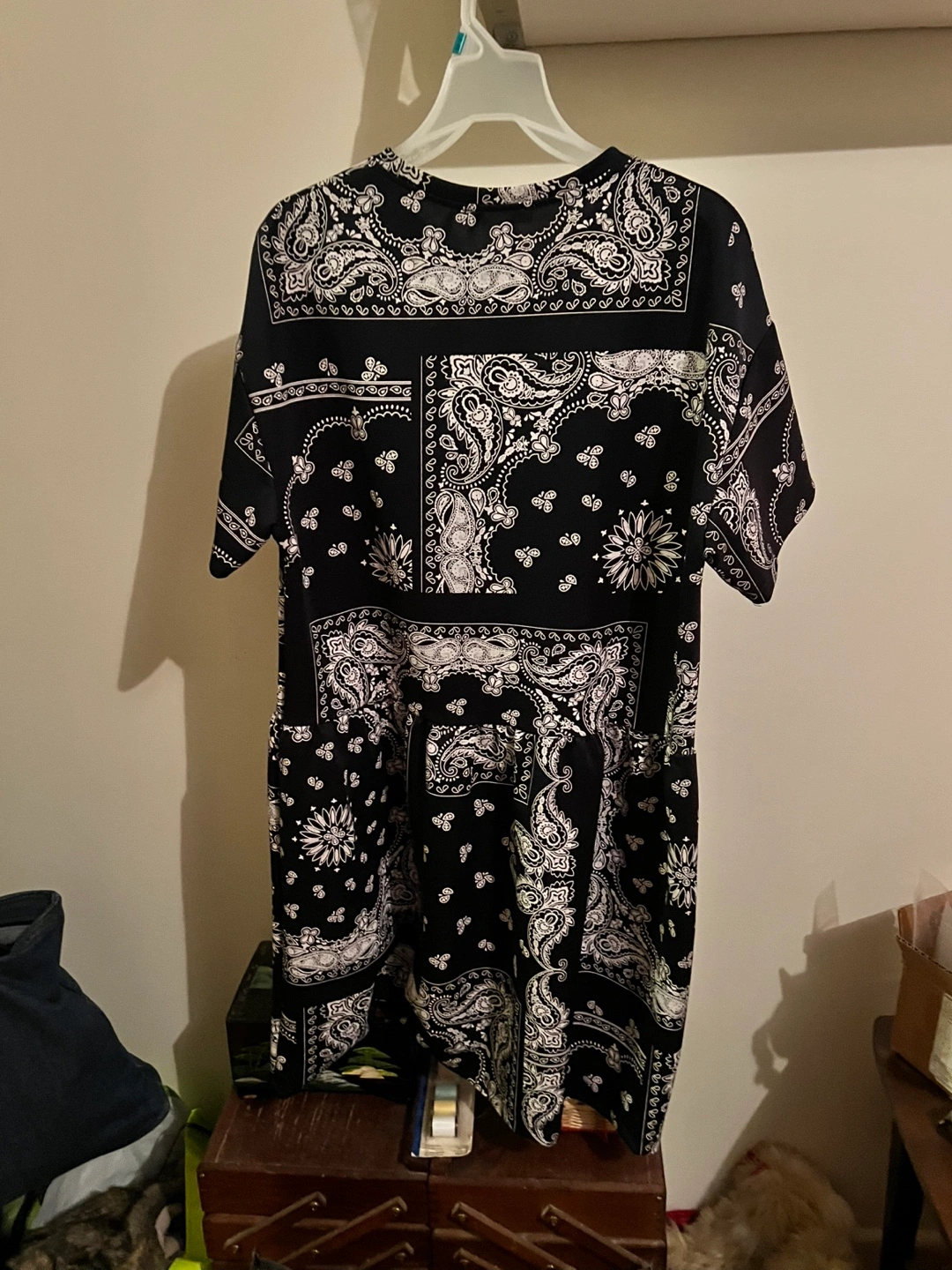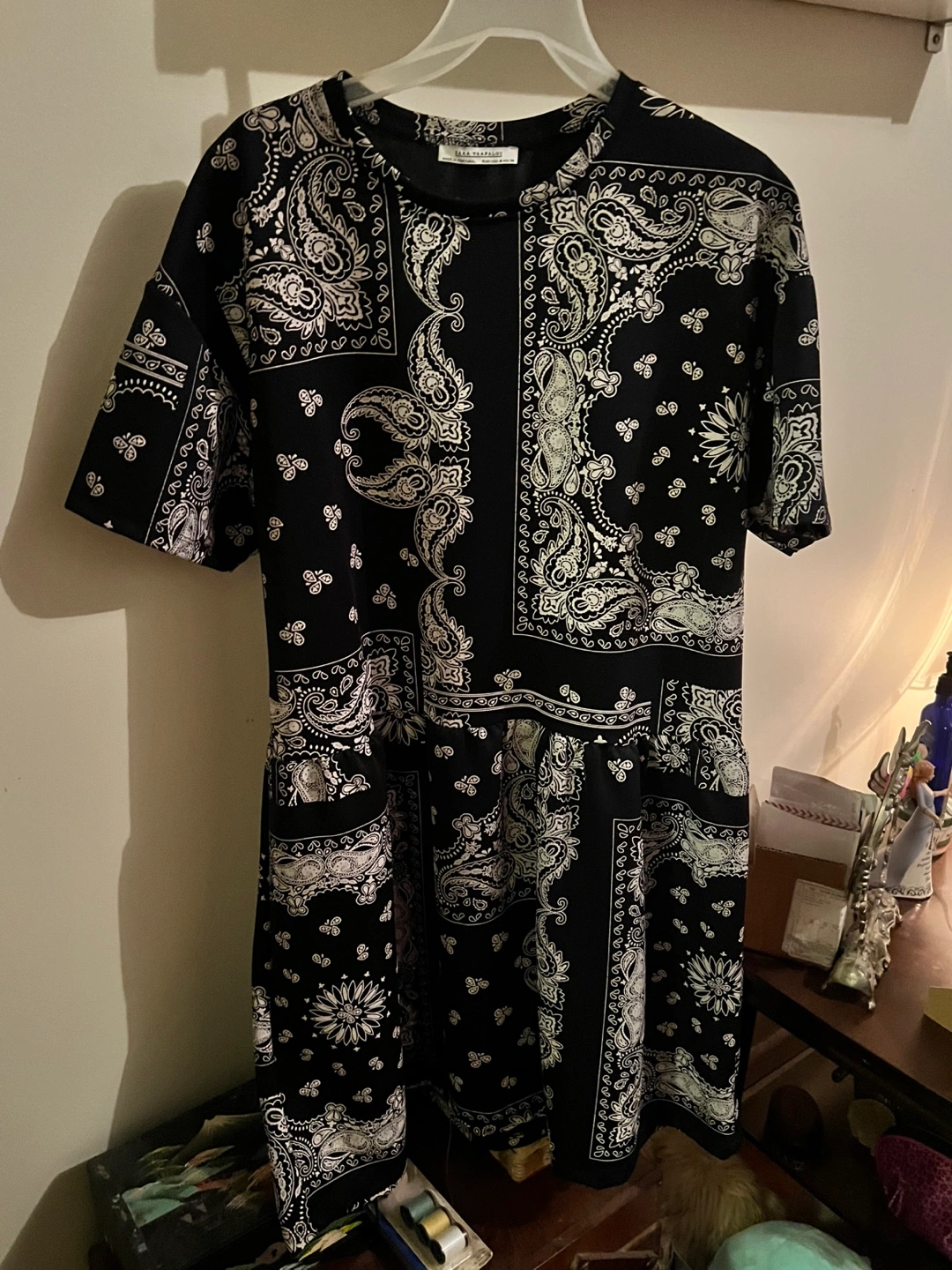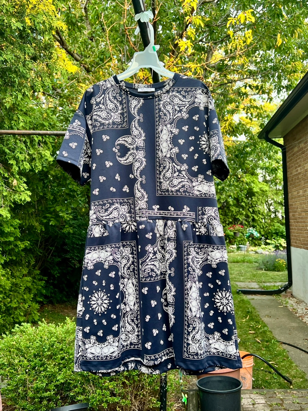44Cute Med. Sized paisley print dress in dark blue and white! It's in great condition and ready for a new home. Daytime wear the blue & by night have the black & white effect going on.