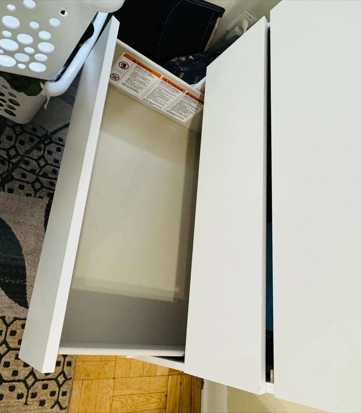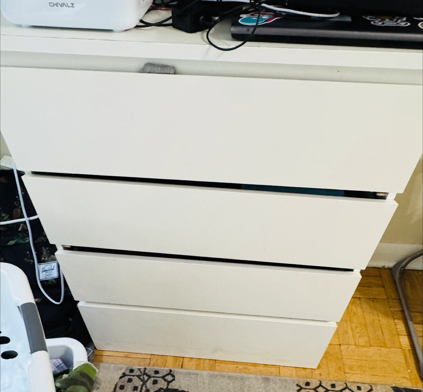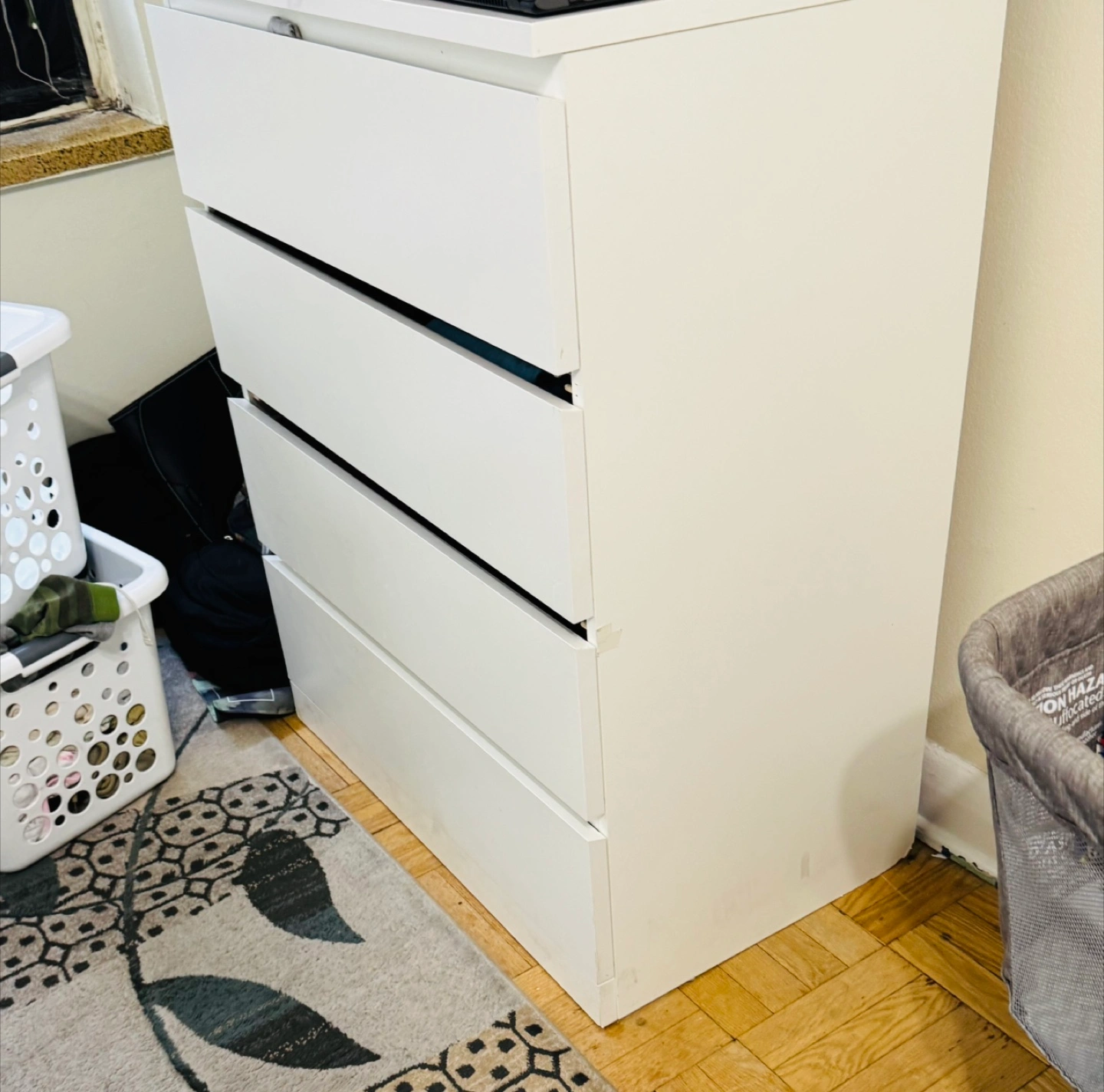 Selling a white four-drawer dresser. It's in good condition and has plenty of space for storage. Great for organizing your clothes or other items!