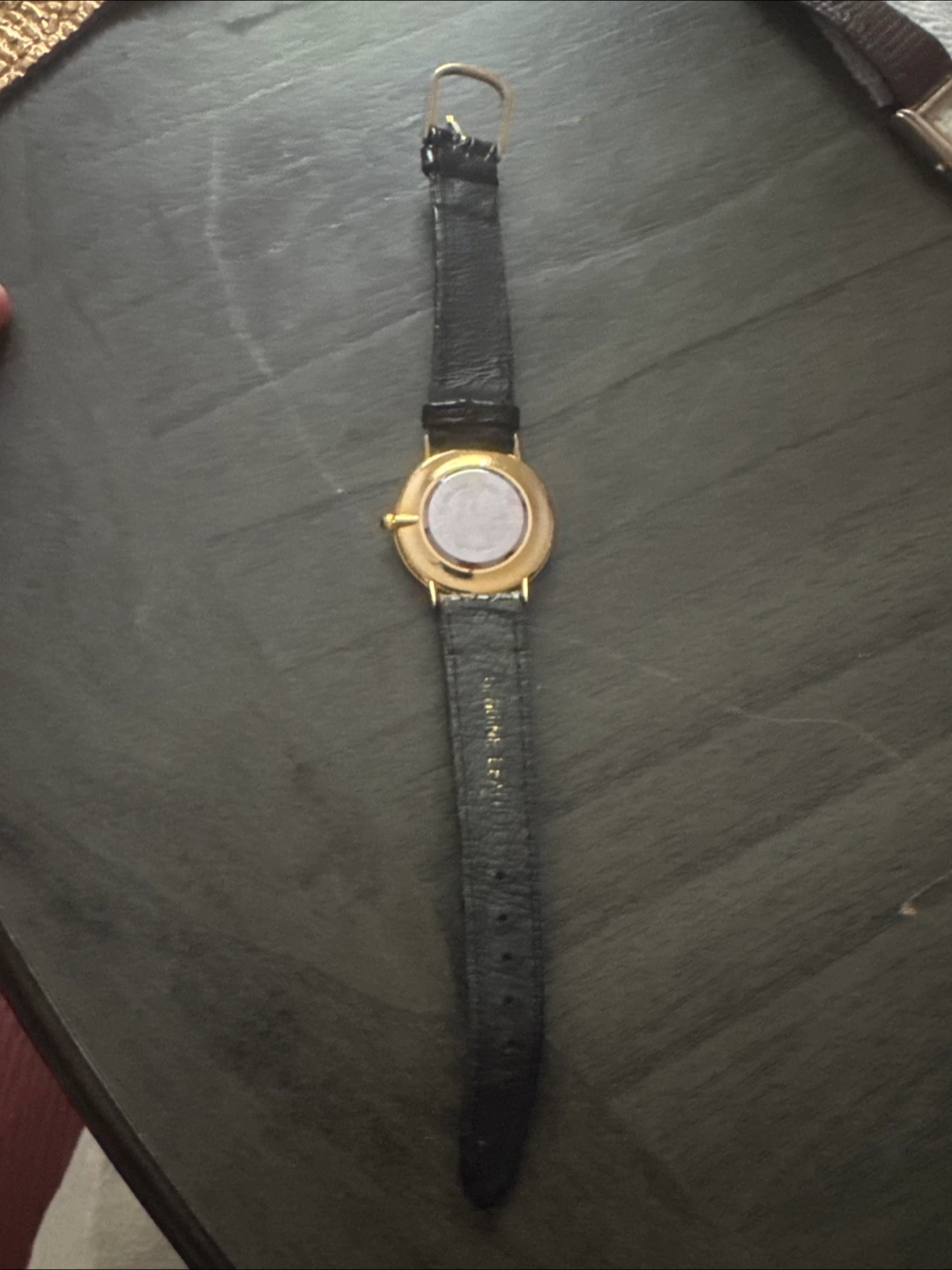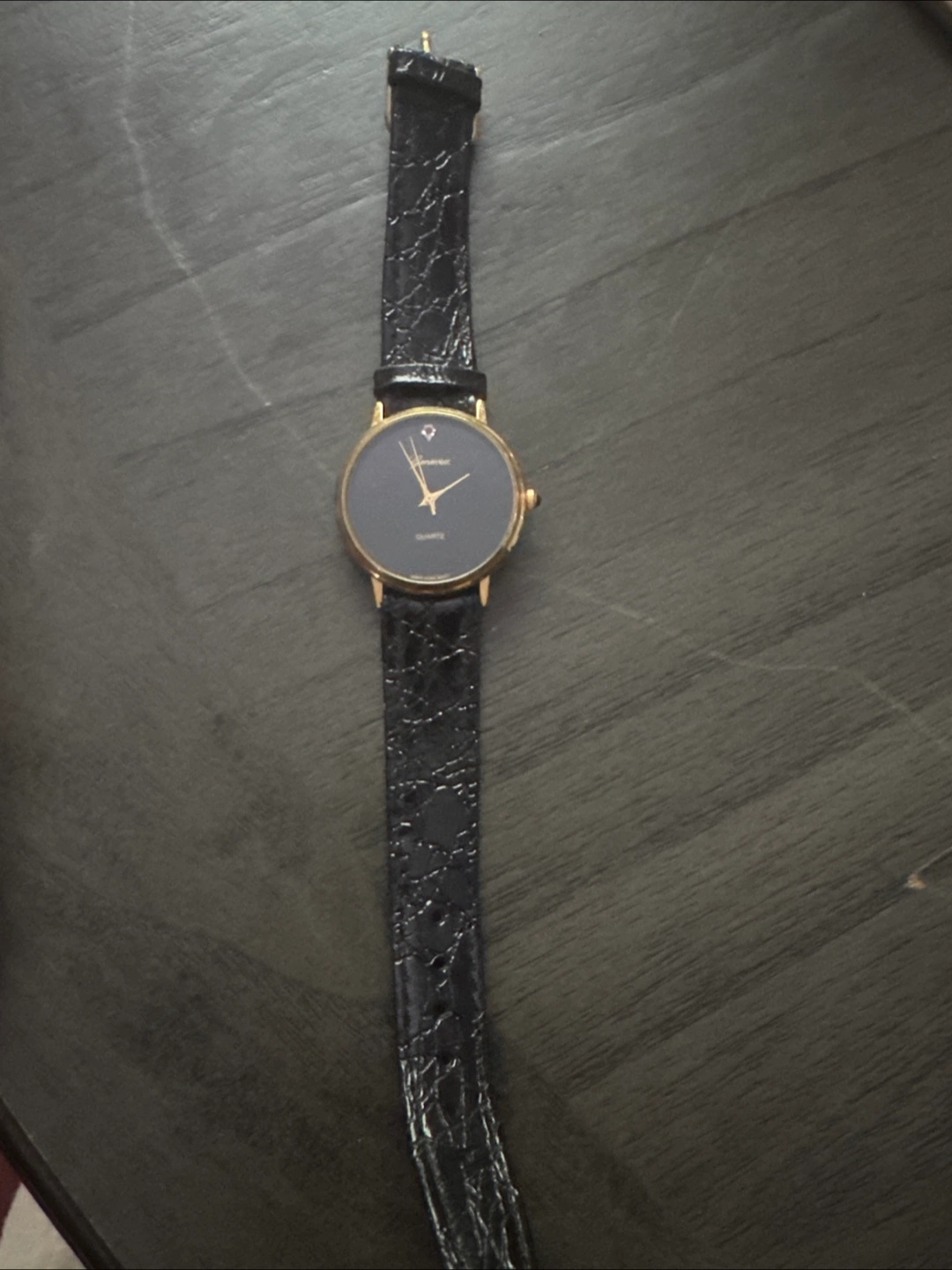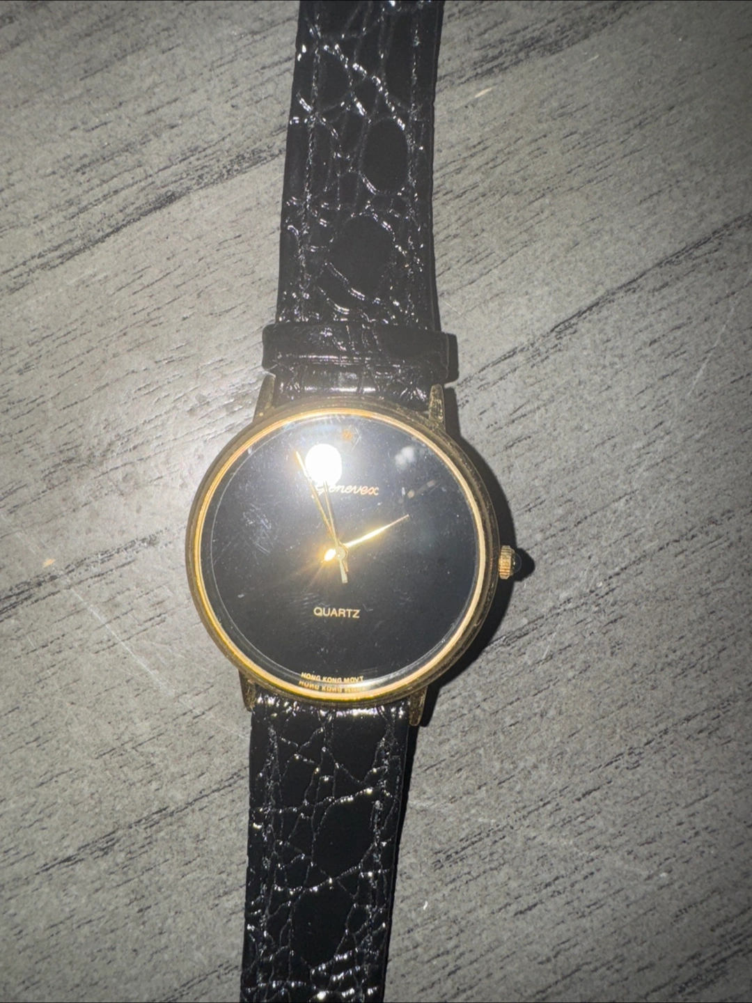 Selling a classic Genovex quartz watch! It features a black face with gold accents and a black leather-like band. The watch has a simple, elegant design, perfect for everyday wear. It's in good condition and ready for a new home