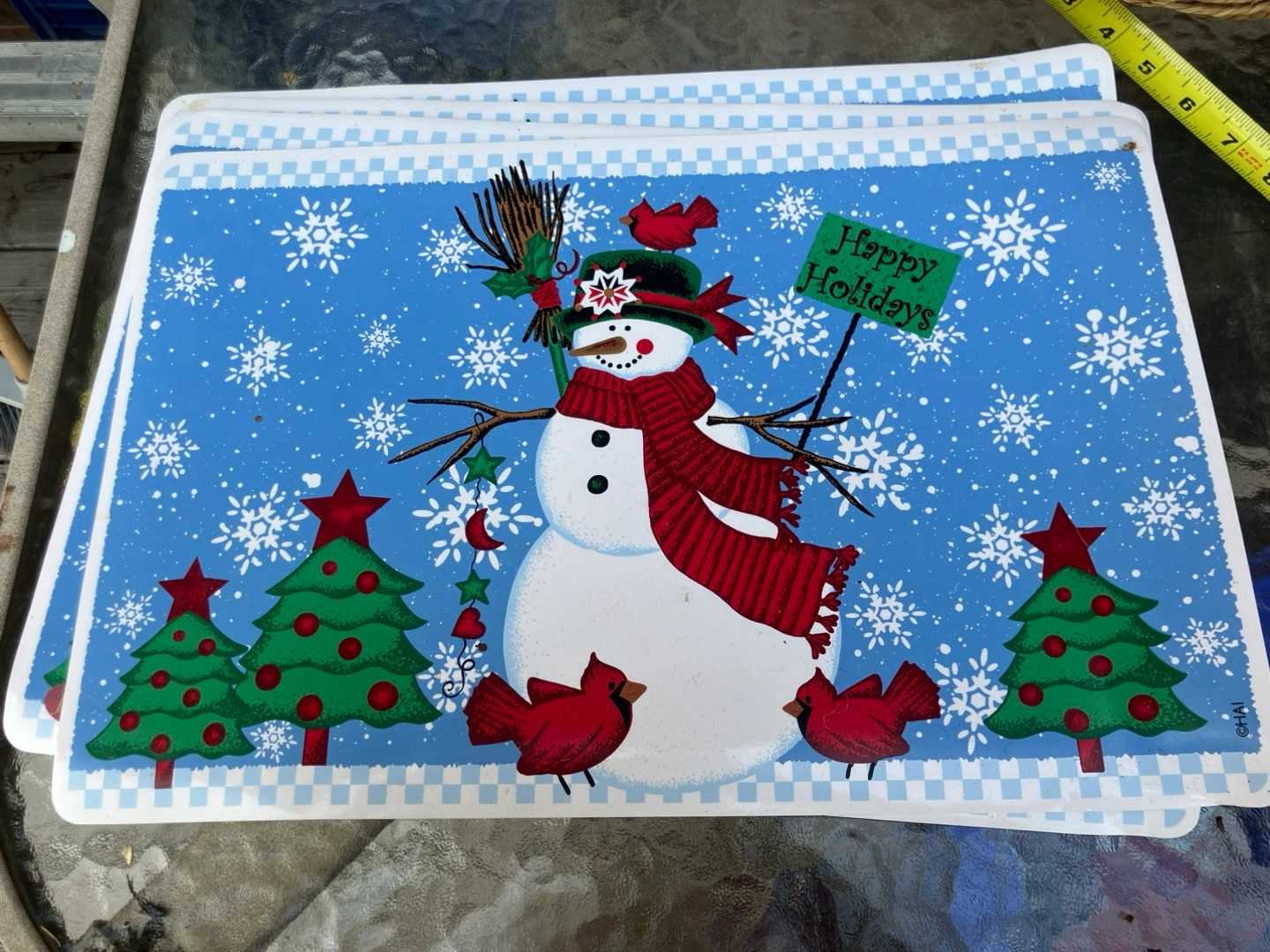 REMOVING POSTThis set of 5 placemats feature a festive holiday design with a snowman, Christmas trees, and snowflakes! They're perfect for adding a touch of seasonal cheer to your dining table during the holidays.
