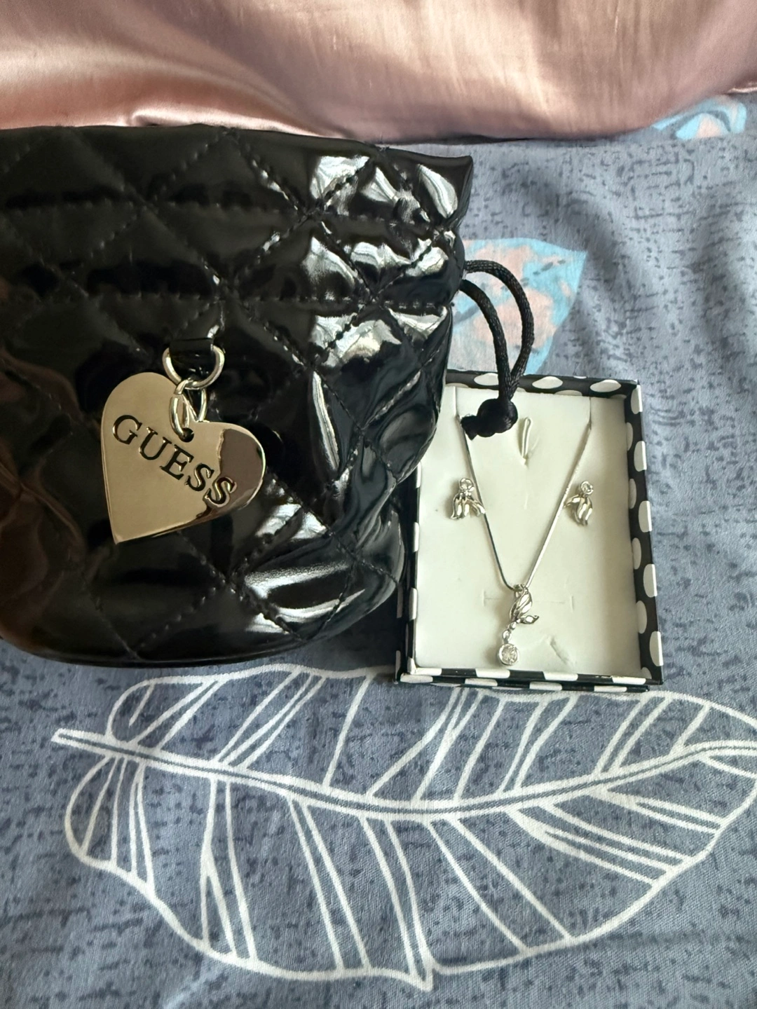 BRAND NEW Stylish black quilted GUESS drawstring pouch with satin inner lining and iconic heart charm—elegant and perfect for gifting or travel. Comes with a lovely silver-tone jewelry set featuring a matching necklace and earrings with delicate charm and stone details. The jewelry set is brand new and boxed.