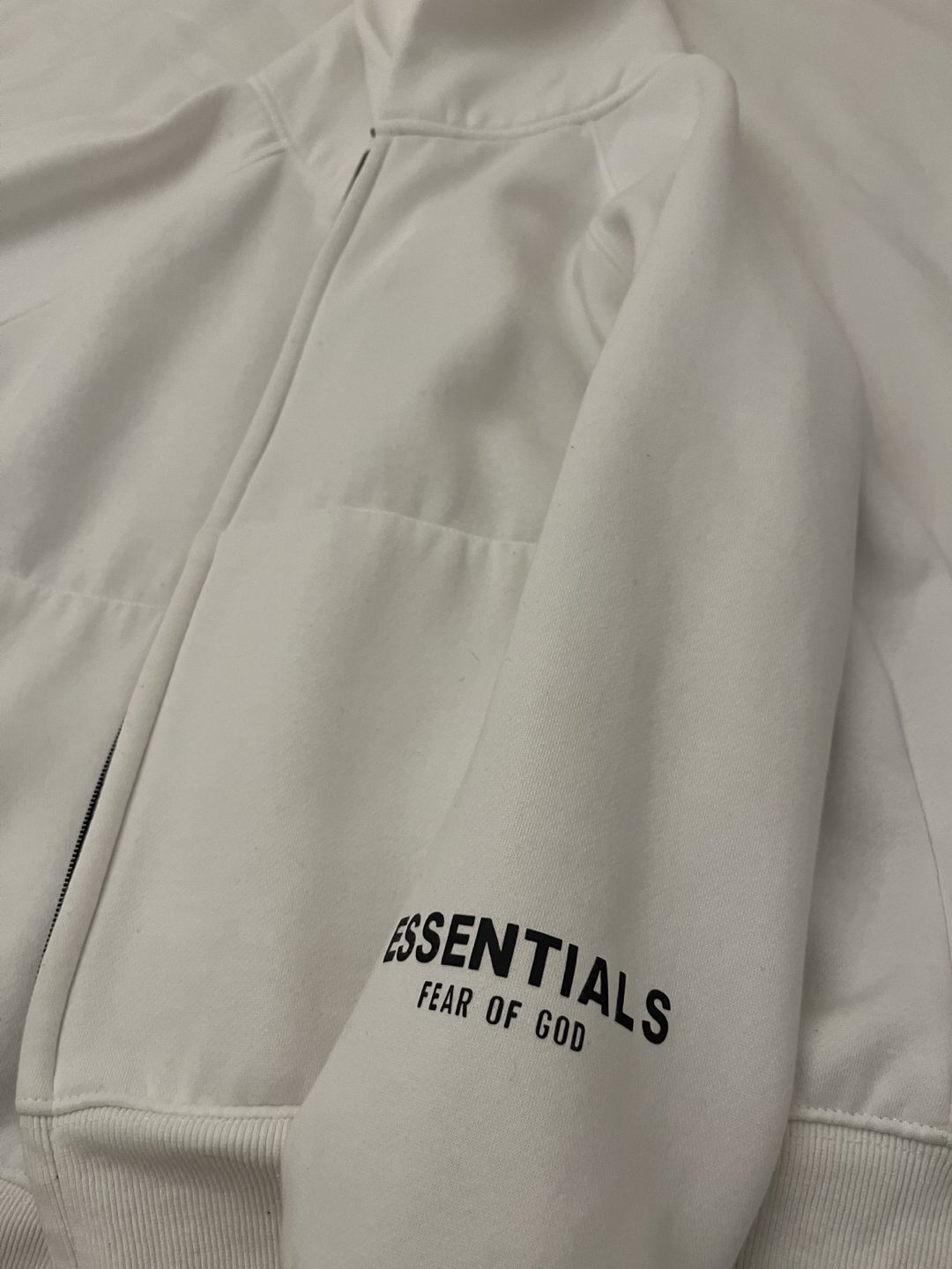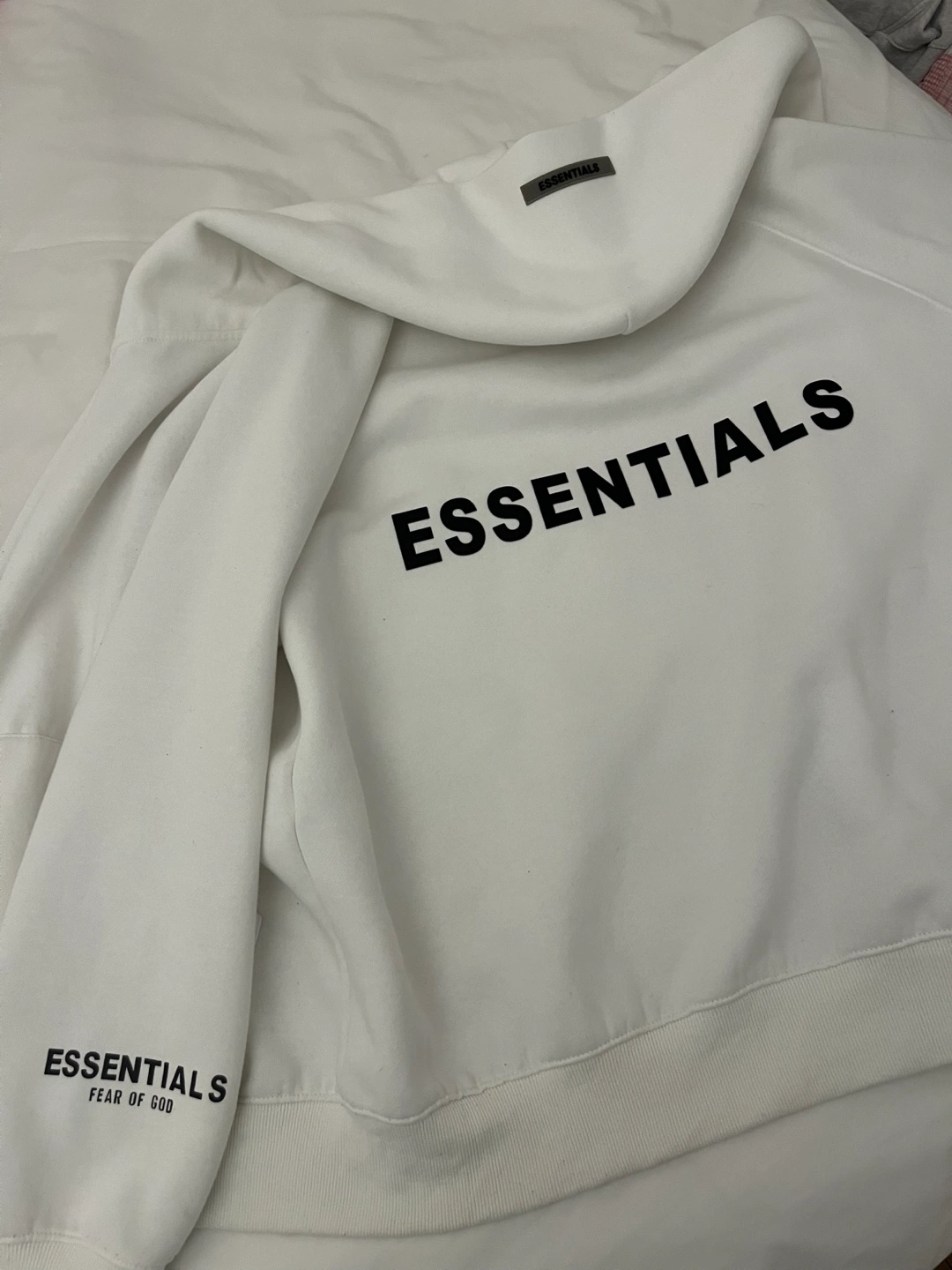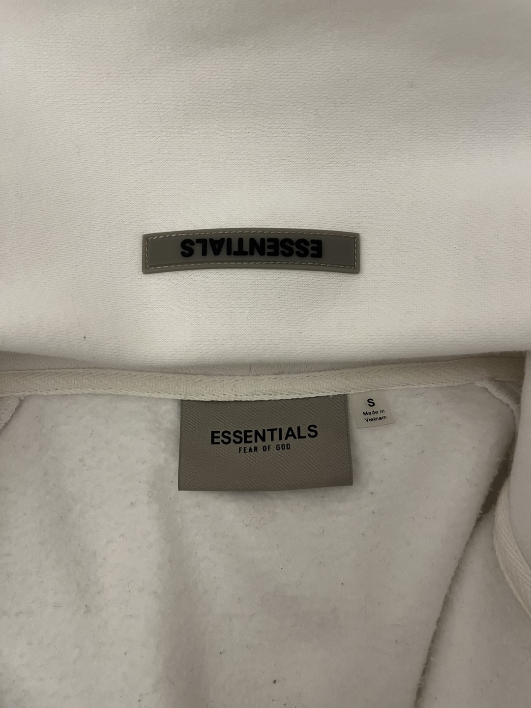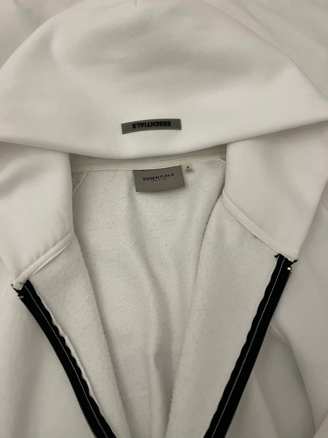 Selling a white zip-up Essentials hoodie. It's a size small but fits like a medium and in good condition!