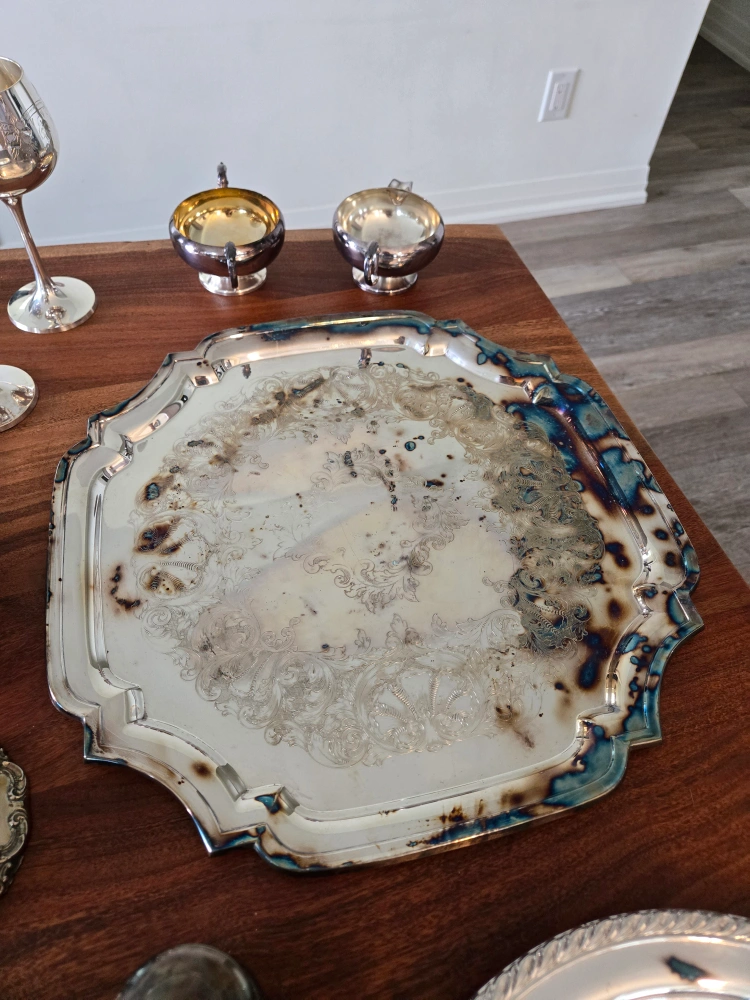 Selling a silver plated serving tray. It has some signs of wear and tarnish, but it's still a beautiful piece for serving or display.