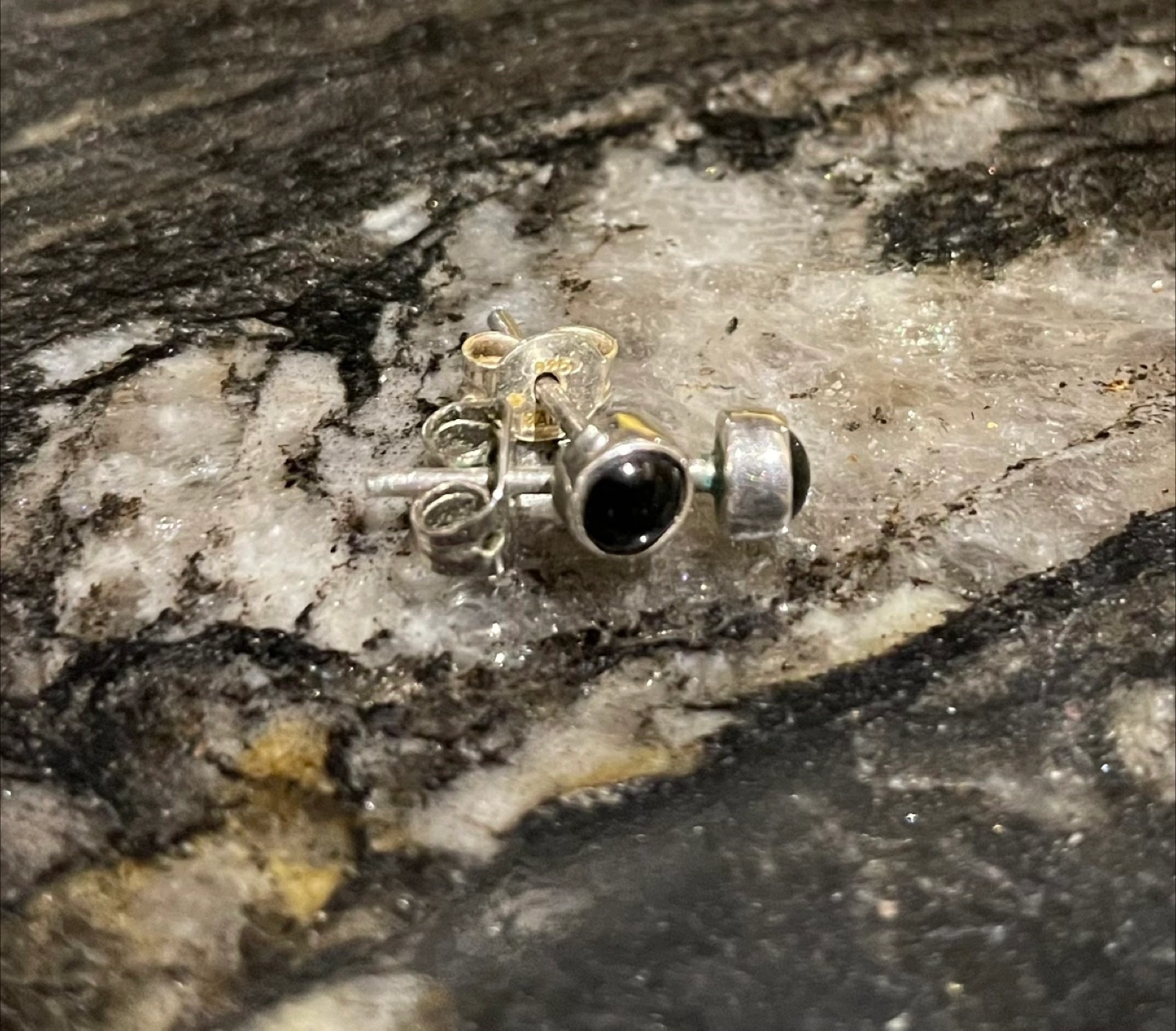 These are a pair of silver stud earrings with a small black stone in the centre. The black stones are very shiny with no scratches.