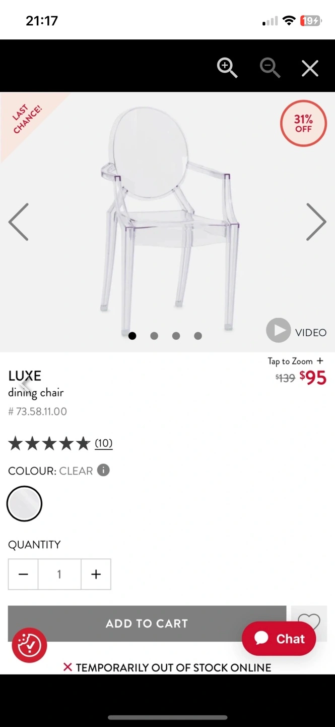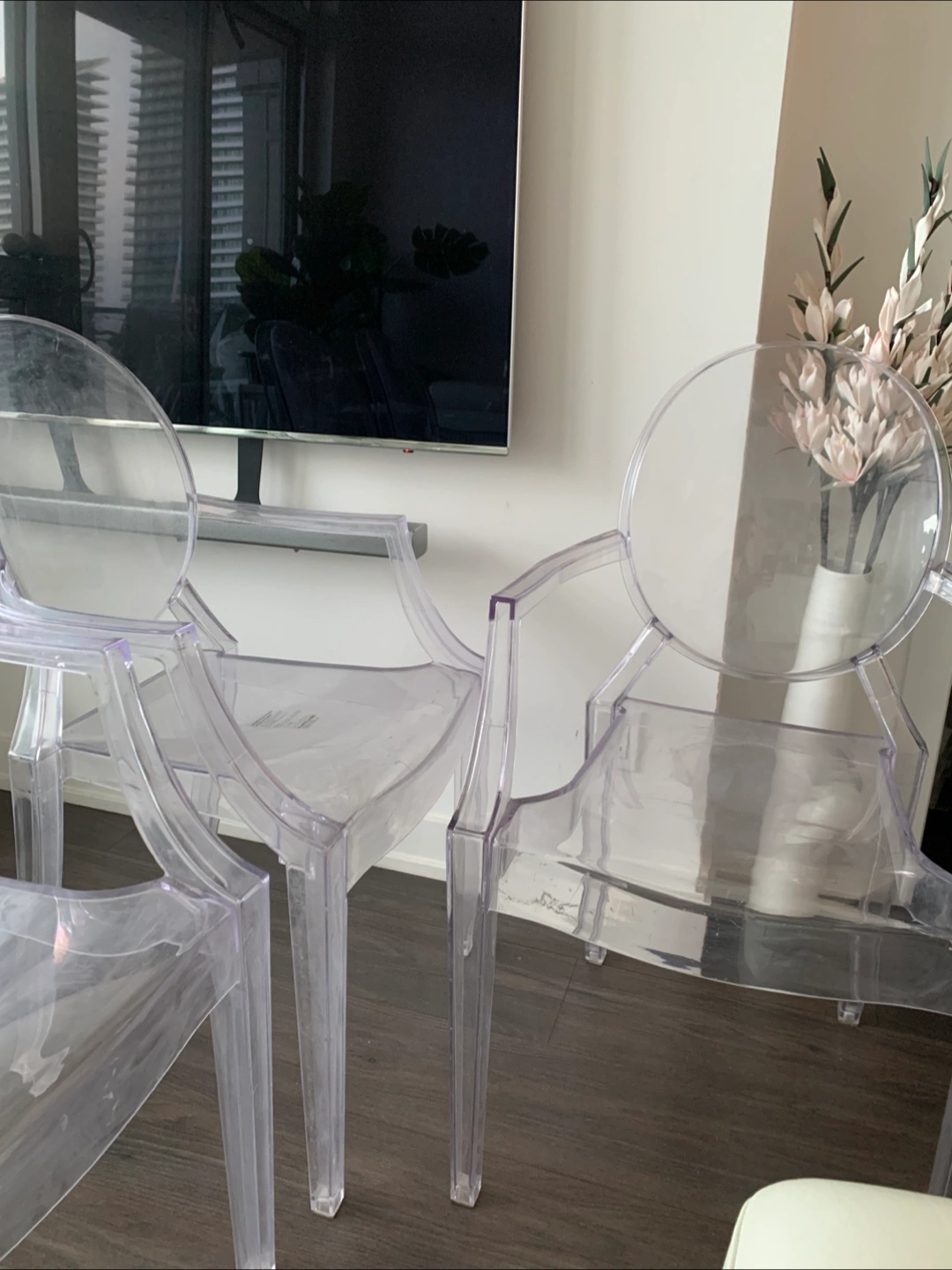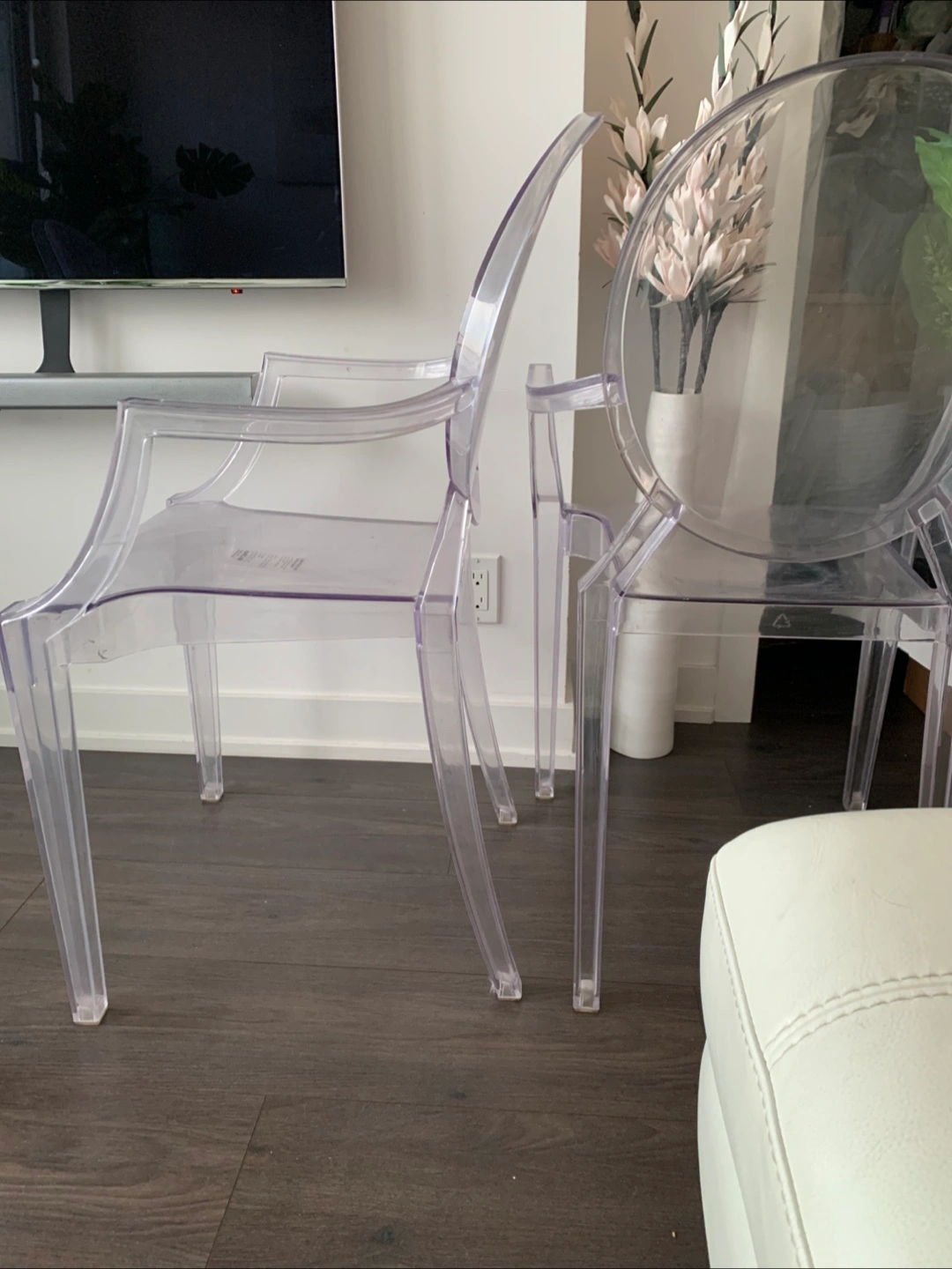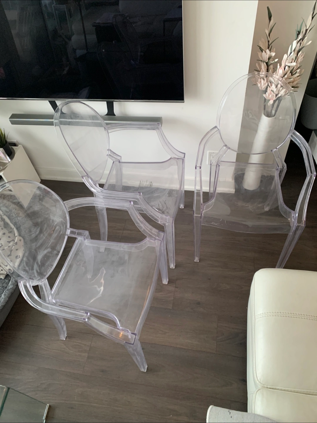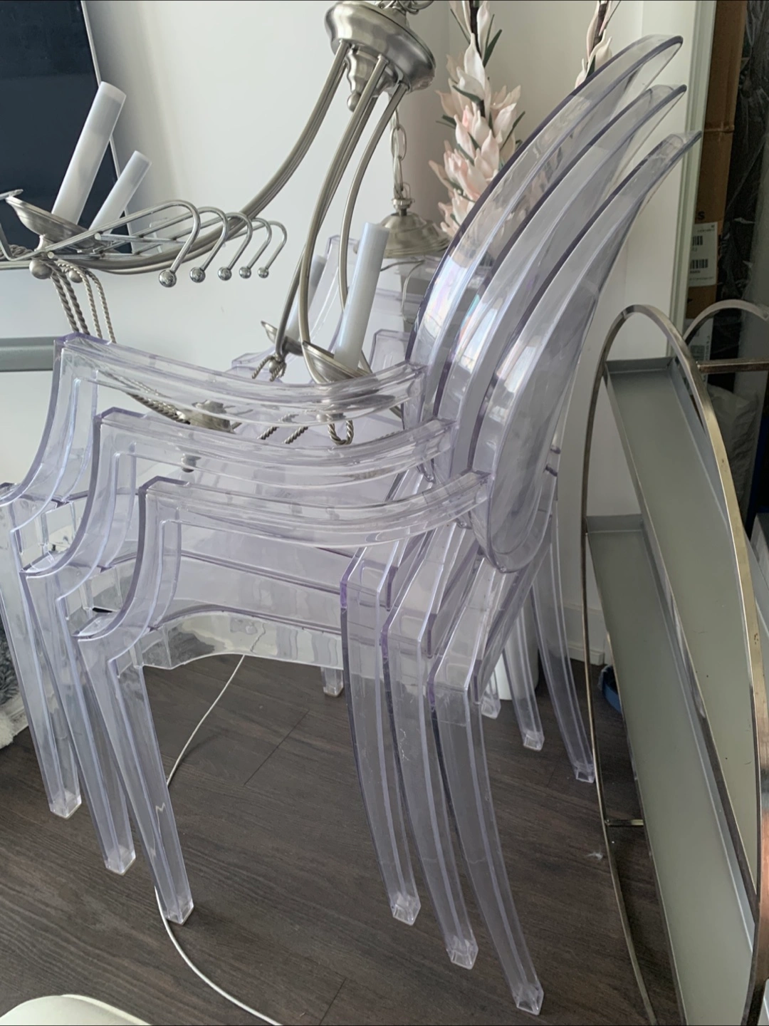 1000+~ 1 chair=$60 Firm. ~ 3 chairs=$160 (save $20!) ~ PRIORITY given to 3 chairs buyers! You need only 2?… Buy 3 and give, sell or keep it as a back-up! • 3 clear/transparent “Ghost” LUXE chairs. •Purchased at “Structube”. • Need a little cleaning. Paid $471.21 tax-in for 3 chairs. So you definitely get the deal of the year, even if they’re second hand!! Cheapest online right now! In excellent condition, these are though chair of very good quality (unlike the Rona/Walmart/etc). The LUXE chairs don’t turn yellow w/ time. Perfect for small places as much as for the larger ones. Make any room (or balcony/patio) look bigger and uncluttered. They were last used outside on a balcony for a couple weeks before being stored. Need a good cleaning. Might have a few superficial scratches (?), but nothing apparent; no cracks, nothing broken. ———— ✅ Also for sale in this pic: -Silver Chandelier: $22. -Large Metal Wall Shelves Unit: $22. ✅ Pick-up n cash only. No holds, first come first serve. Prefer same day pick-up. Map on listing. Thx! 💛Look at my listings for great bundle discounts.