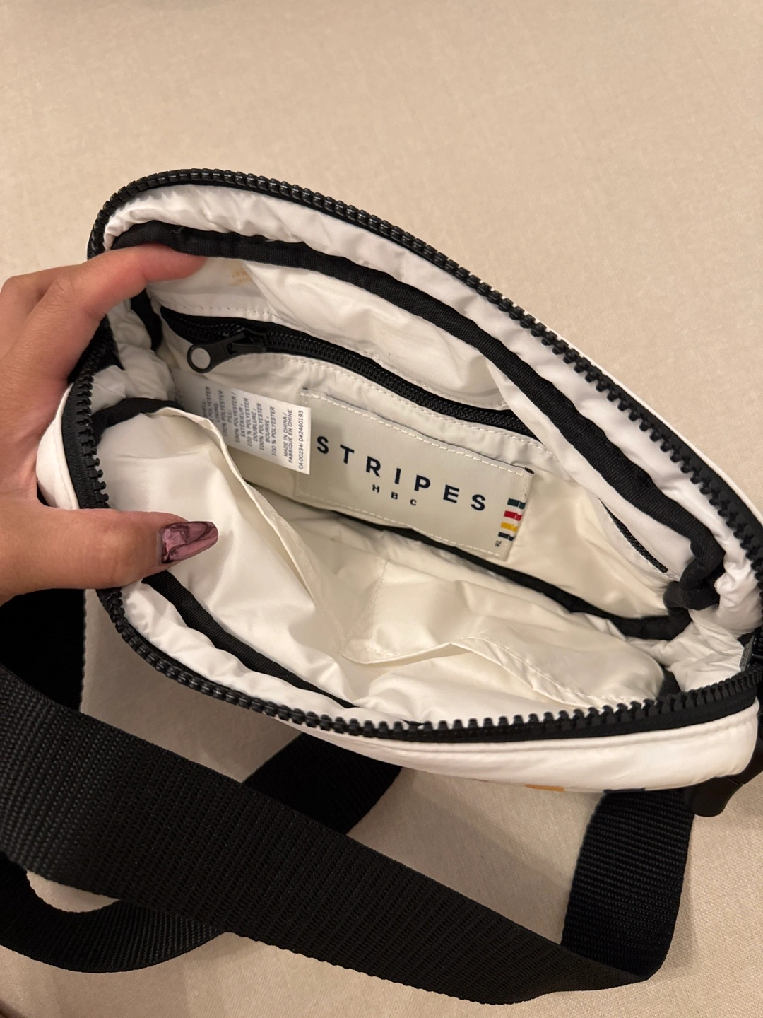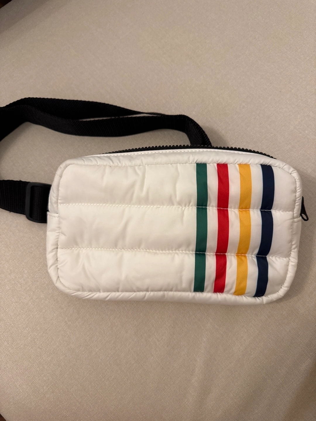 Cute stripes white belt bag from HBC! It features the classic HBC stripes and is in great condition. Perfect for carrying your essentials or walking your dog while keeping your hands free.