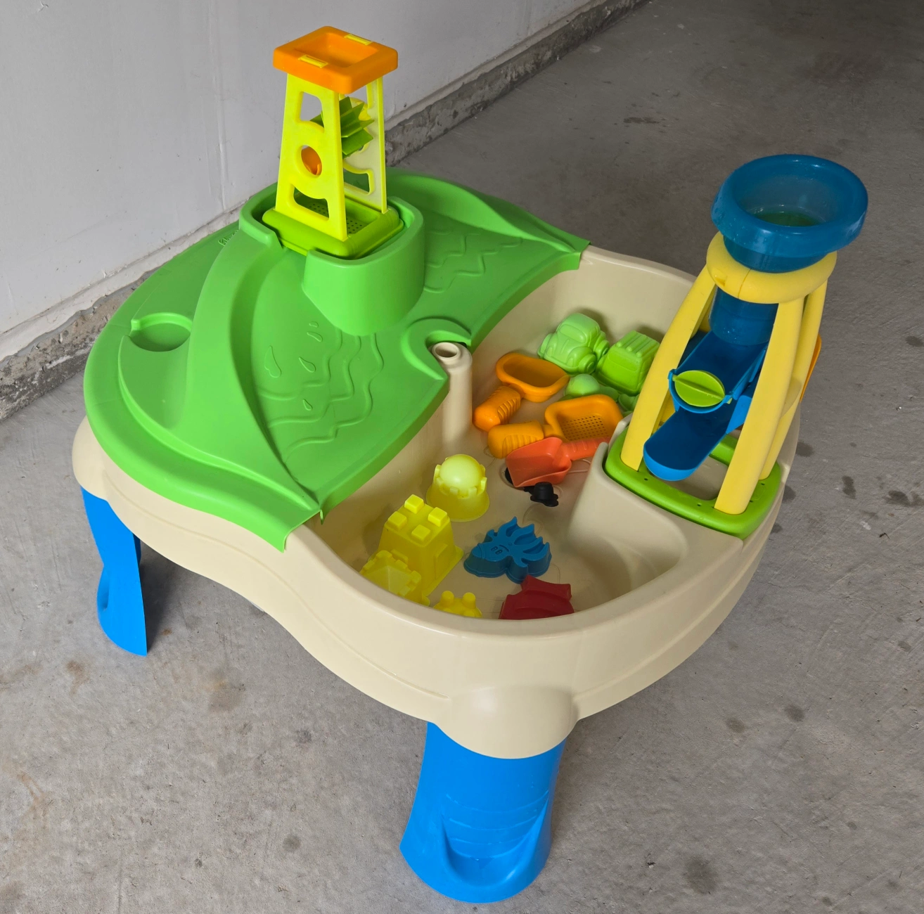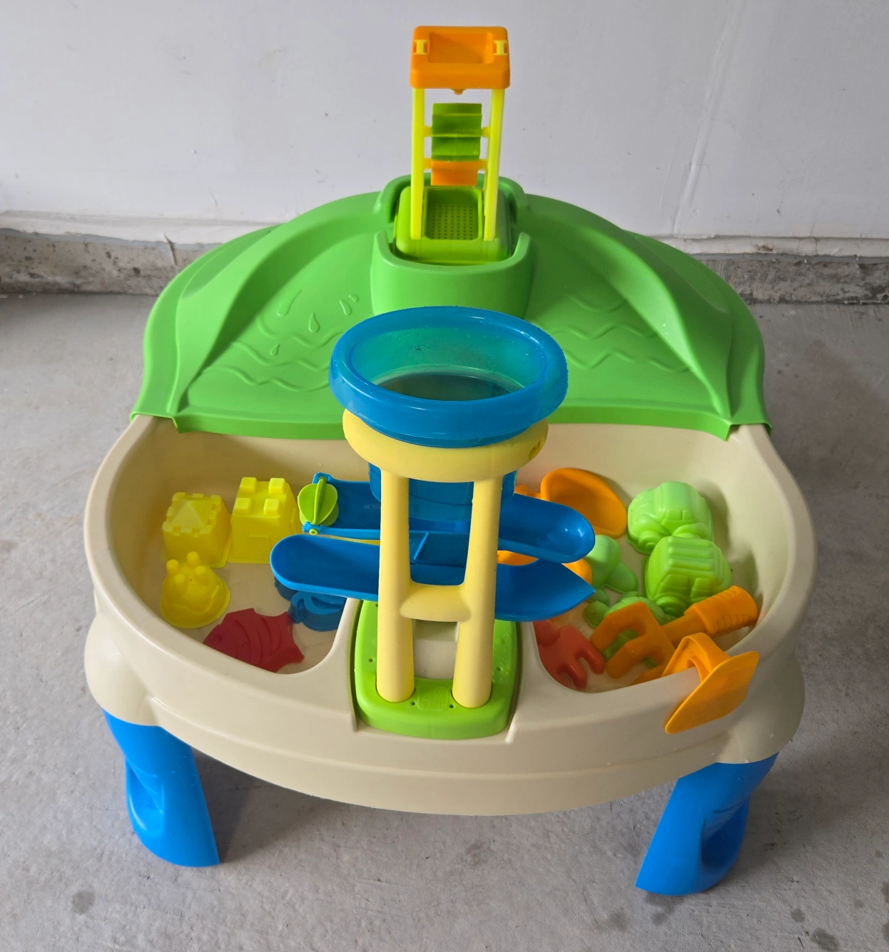 Includes various accessories such as water tower, scoop, shovel set, beach molds.