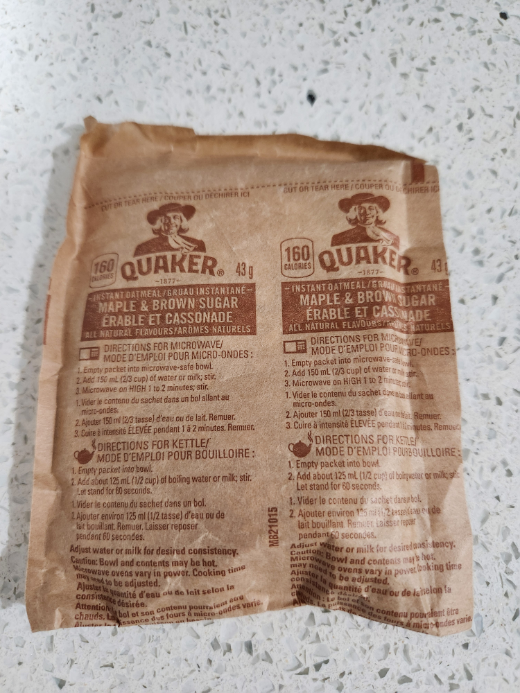 Individual packets of Quaker Instant Oatmeal in Maple & Brown Sugar flavour. Each packet is 43g and can be prepared in the microwave or with boiling water. Not a fan