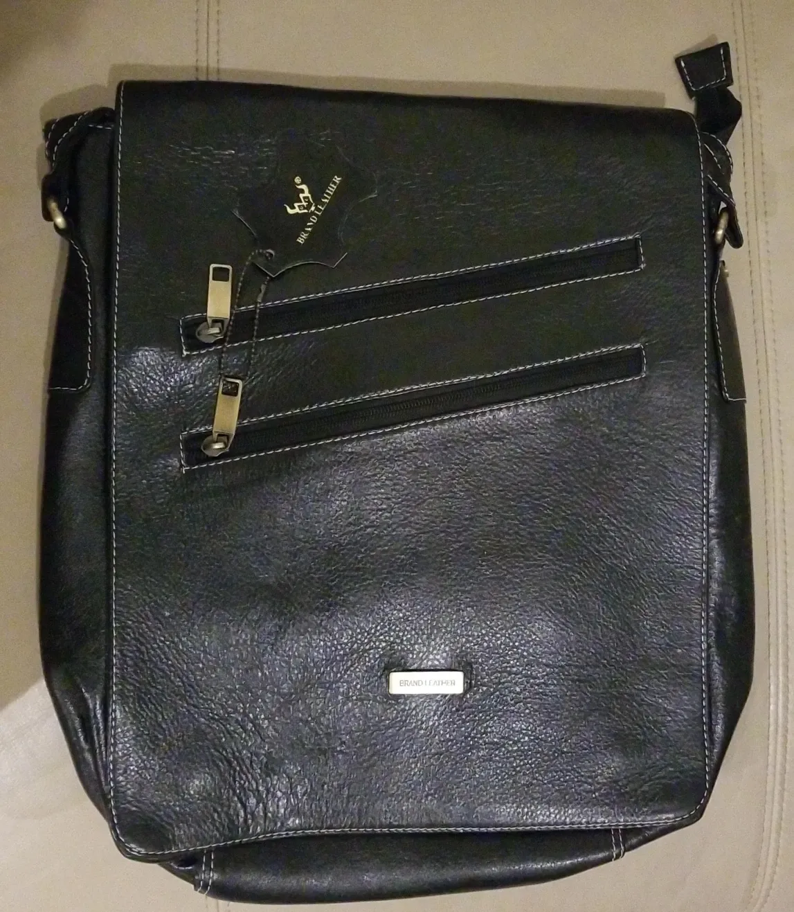 Here's a stylish black messenger bag from Brand Leather! It has a classic design with multiple zipper compartments for organizing your essentials. Perfect for work, school, or everyday use!
