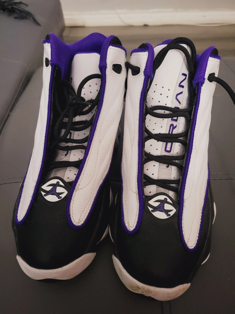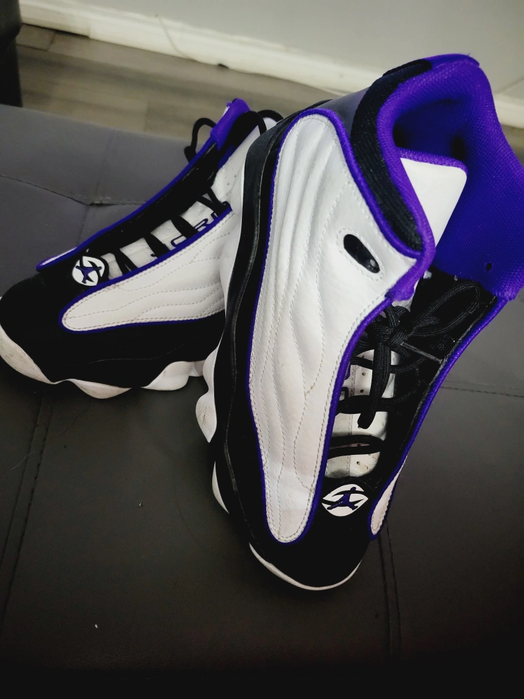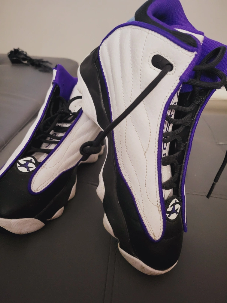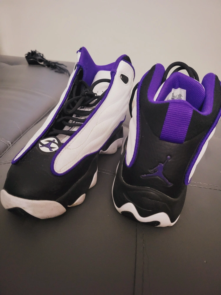 Selling a pair of Jordan T.R.U.N.N.E.R. basketball shoes in size 5 youth, They're a stylish mix of black, white, and purple. Perfect for hitting the court or just adding some flair to your everyday look!