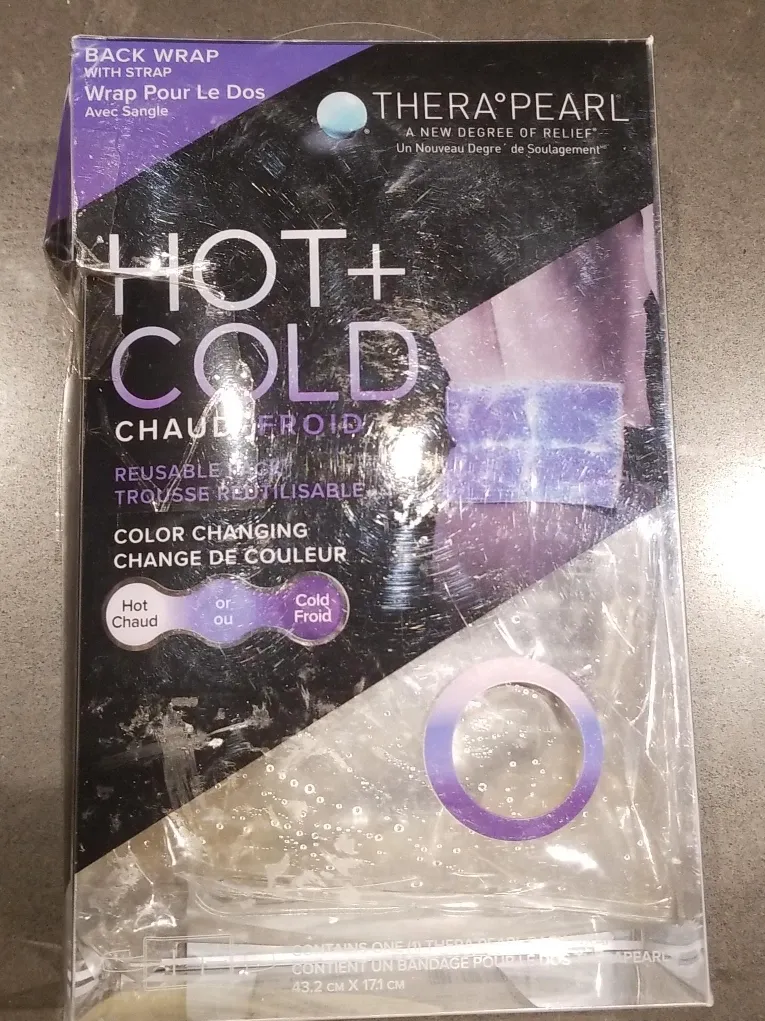 Selling a Thera Pearl Hot + Cold back wrap with strap! It's reusable and color changing, switching between hot and cold. Contains one bandage for the back, measuring 43.2 cm x 17.1 cm