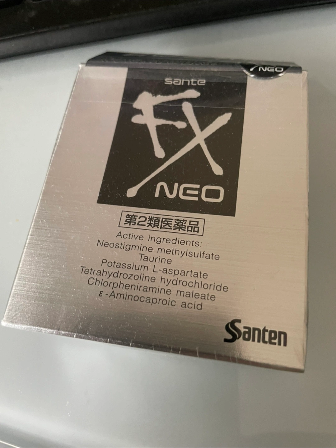 A box of Santen Sante FX Neo eye drops. These contain active ingredients like neostigmine methylsulfate and taurine to help refresh your eyes! Note: it already passed the best before date on April 2025.