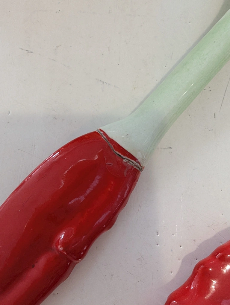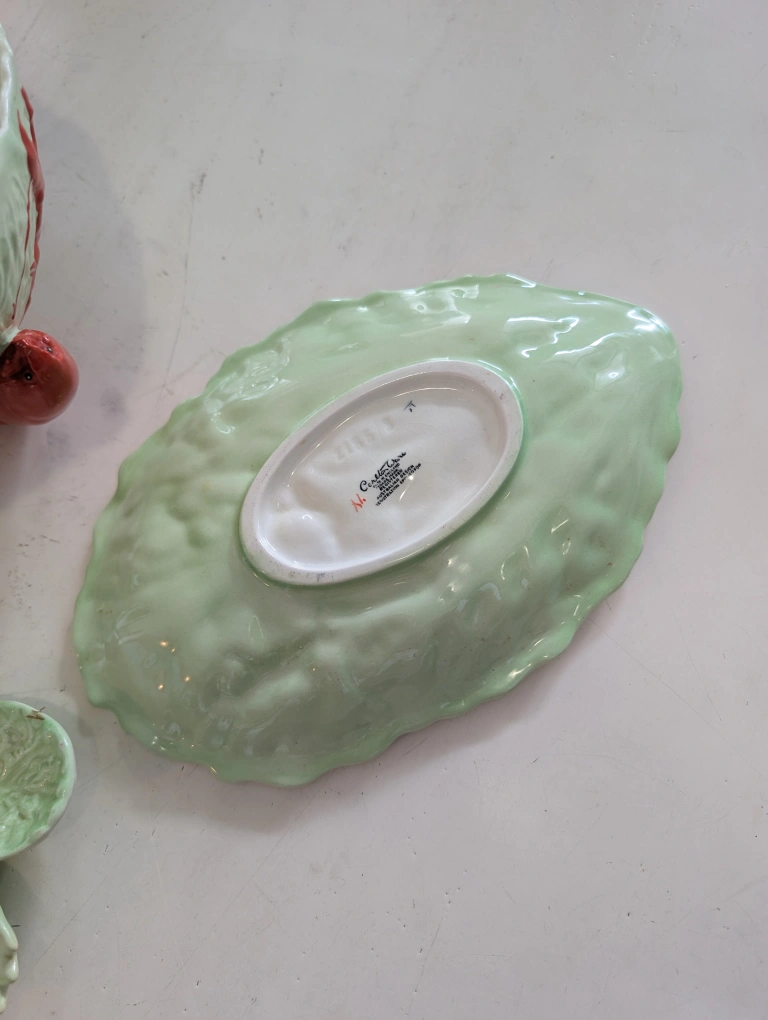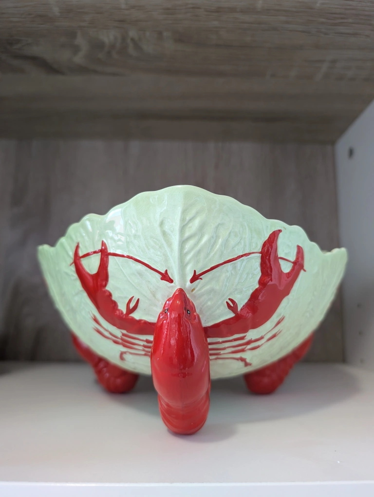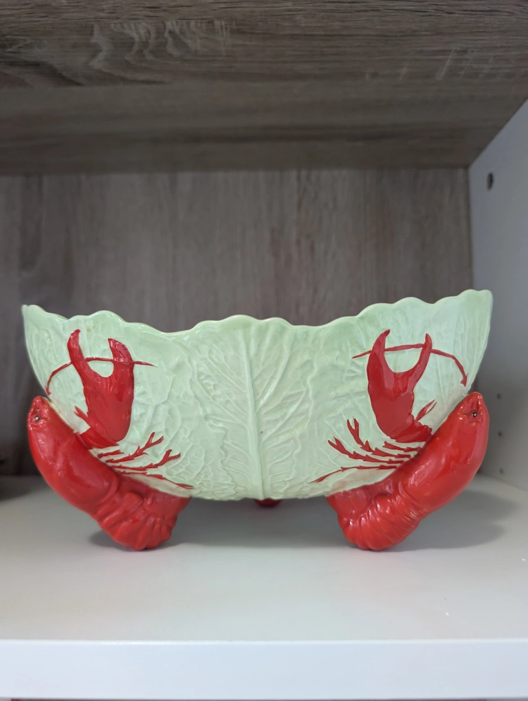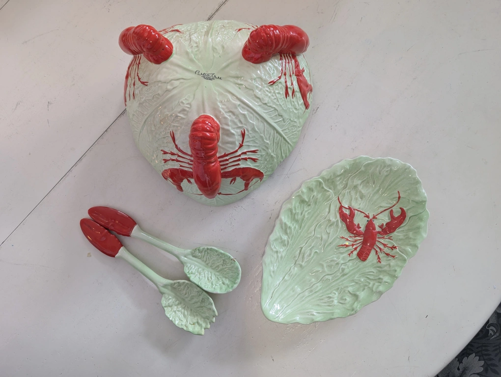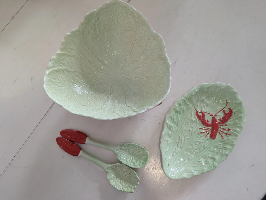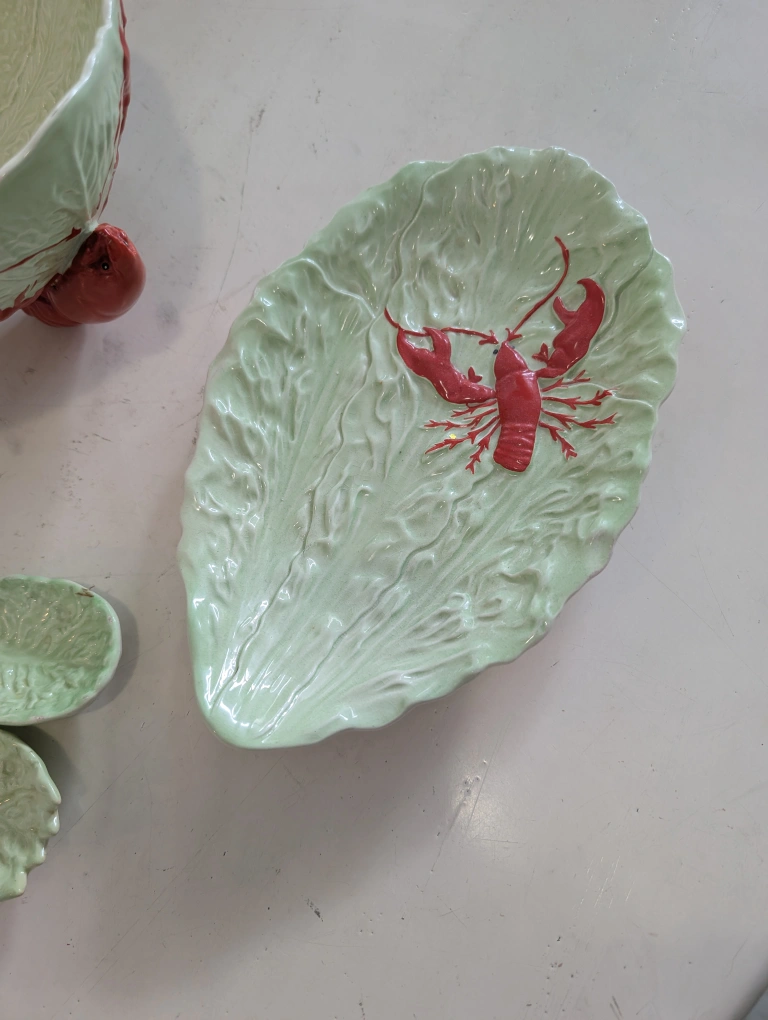 Selling a vintage Castle Rose serving bowl set! It features a unique cabbage leaf design with lobster accents. The set includes a bowl and serving utensils. There is some wear/break on the utensils, as shown in the photos.